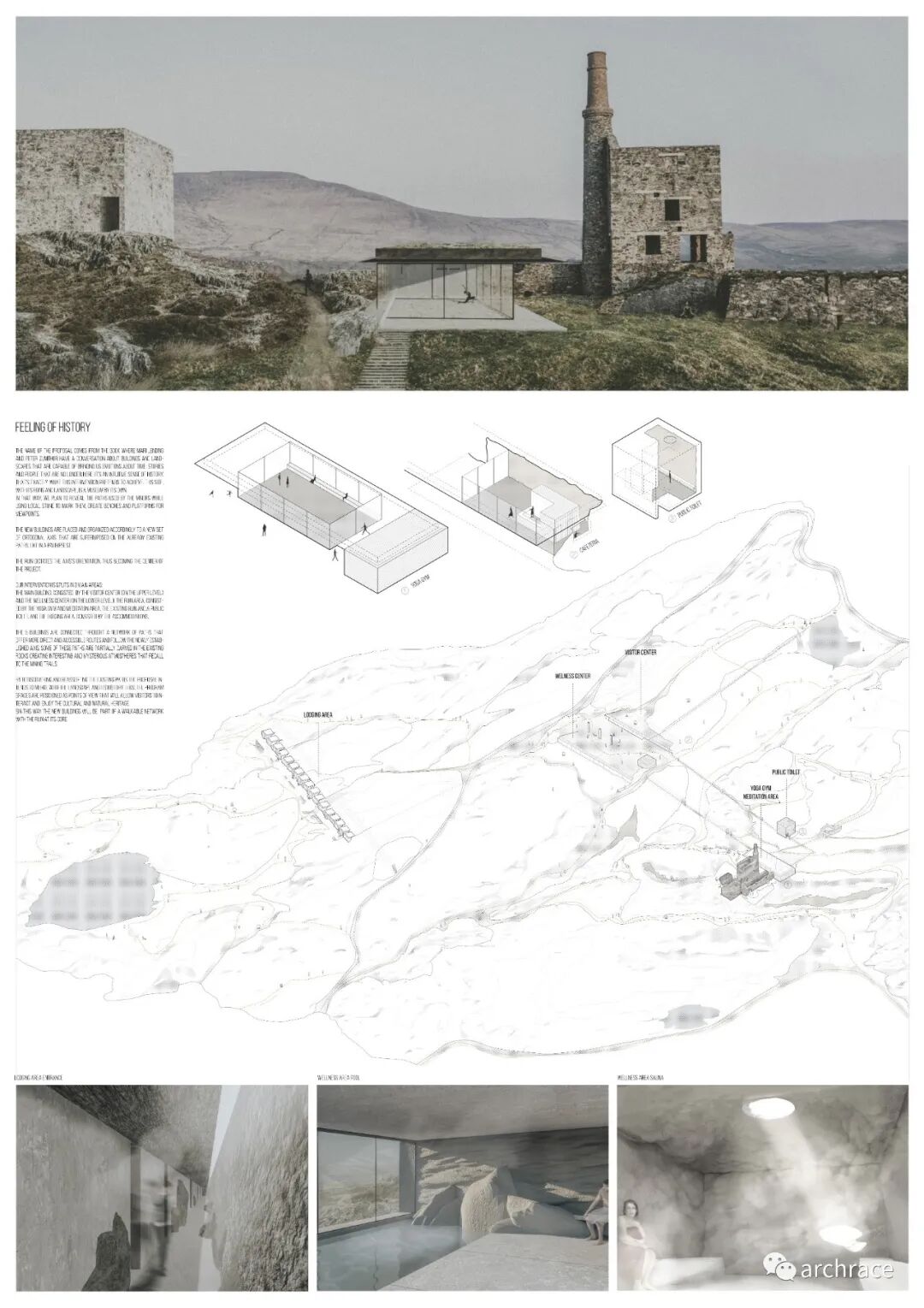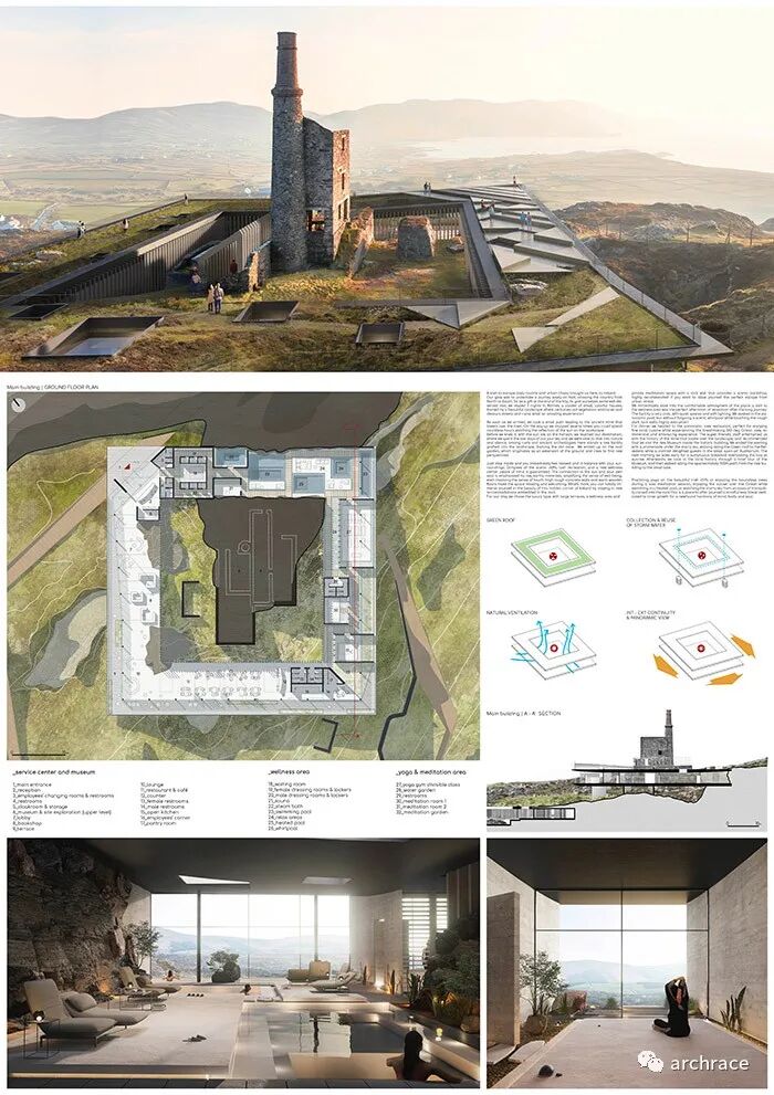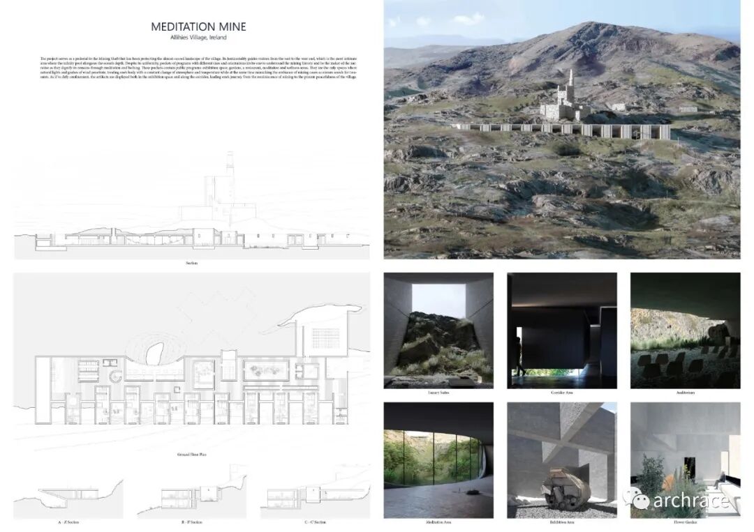 爱尔兰冥想矿井设计竞赛在去年5月由 YAC – Young Architects Competitions 发起,目标是将爱尔兰工业遗址改造成一个静修和冥想的目的地,供那些试图远离现代城市生活,在神秘之美中寻找有意义的体验和永恒的本质的人们使用。 参赛者需要关注 Allihies,这是一个前矿工村庄,坐落在古老铜矿遗址所在的山丘之间,俯瞰着大西洋。参赛者的目标是设计一个独特的地方,成为一个重新发现幸福与宁静价值的社会的象征性目的地。古老的矿山是为了从山上开采矿物而建造的。然而,在如今的废墟中,也许当代人类可以挖掘出比矿场更有价值的东西,并探究是何原因让当代社会的和平与和谐受到了危害。 来自 100 多个国家/地区的设计师参加了这一引人注目的挑战,提出了他们宝贵的概念想法,并由优秀的评委们进行了评估,成员包括董功 (Vector Architects)、胡如珊 (Neri &Hu)、Neil Hubbard (Heatherwick Studio)、Valerie Mulvin (Mccullough Mulvin) 建筑师)和 Federico Pompignoli(前 OMA)。前五名的获奖项目会获得总计 15,000 欧元的现金奖励。 来自法国的设计团队赢得了第一名,两位设计师 Matthieu Faria 和 Pierre Ide 提出的设计提案将自然和人工制品置于紧张状态,并认为干预的所有共生与和谐都取决于建筑物与其所在的自然环境共存的能力。他们将功能嵌入山体岩石中的意图使建筑谨慎地融入远景与近景、建筑与自然之间的密切关系中。 意大利团队 Mograph Studio 获得第二名,团队成员包括 Matteo Amicarella 和 Giovanna de Simone,他们设计了一个为游客提供专注于内心成长的正念休息场所,以实现思想、身体和灵魂的新和谐。 来自澳大利亚的 Yeji Cha、Jin Kyung Kim、Jeewon Koo、Bora Kim 组成的 ABBO1 团队获得第三名。他们的设计作品设想在 Allihies 的大自然中创造一种身临其境的体验。通过细致响应景观的建筑探索,设计提案鼓励游客重新融入自然,并重新发现 Allihies 的历史价值,其中通过改造原机房作为接待游客和提供教育功能而被重新定义。 两个金提名奖之一授予来自厄瓜多尔的 Marcelo Suarez,他的改造方案是一组作品,其体积和排列突出了废墟的特征和使用矿山和借鉴当地建筑的逻辑。另一个提名奖授予了 AnT_MT (Antigoni Antonopoulou) 团队,他们设计的建筑就像一块矿石,从景观中浮现出来,正等待被发现。简洁的线条和形体与荒野、废墟形成鲜明对比。