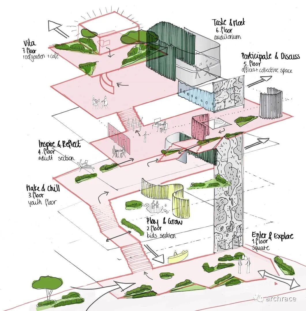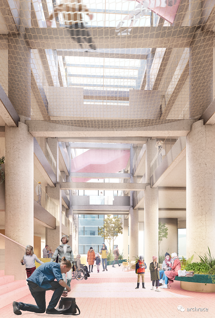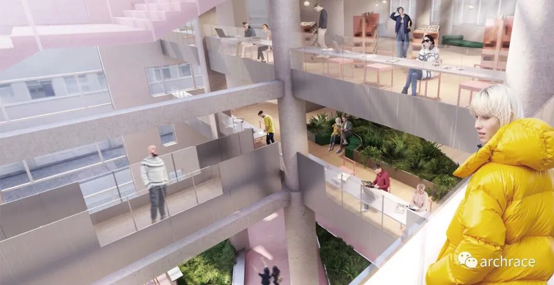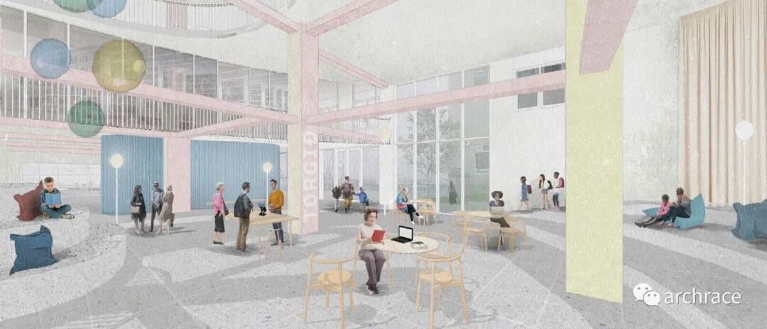 获胜方案在建筑种编织了一条“浅粉色”的知识体验之路,从街道开始,穿过原有的坚固的混凝土柱结构。沿线针对不同的目标群体组织了丰富多彩的活动,通过体验激发他们的灵感。