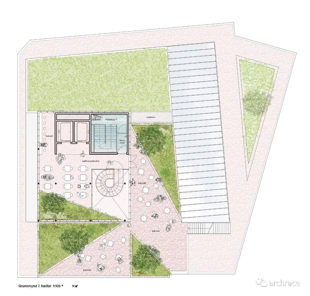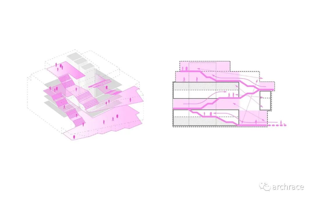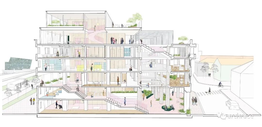 通过复杂的平面图,设计团队希望提供一条清晰的路线,在这条路线中永远不会出现死胡同,并吸引人们去探索。这也对现有建筑的底部楼层提出了挑战。