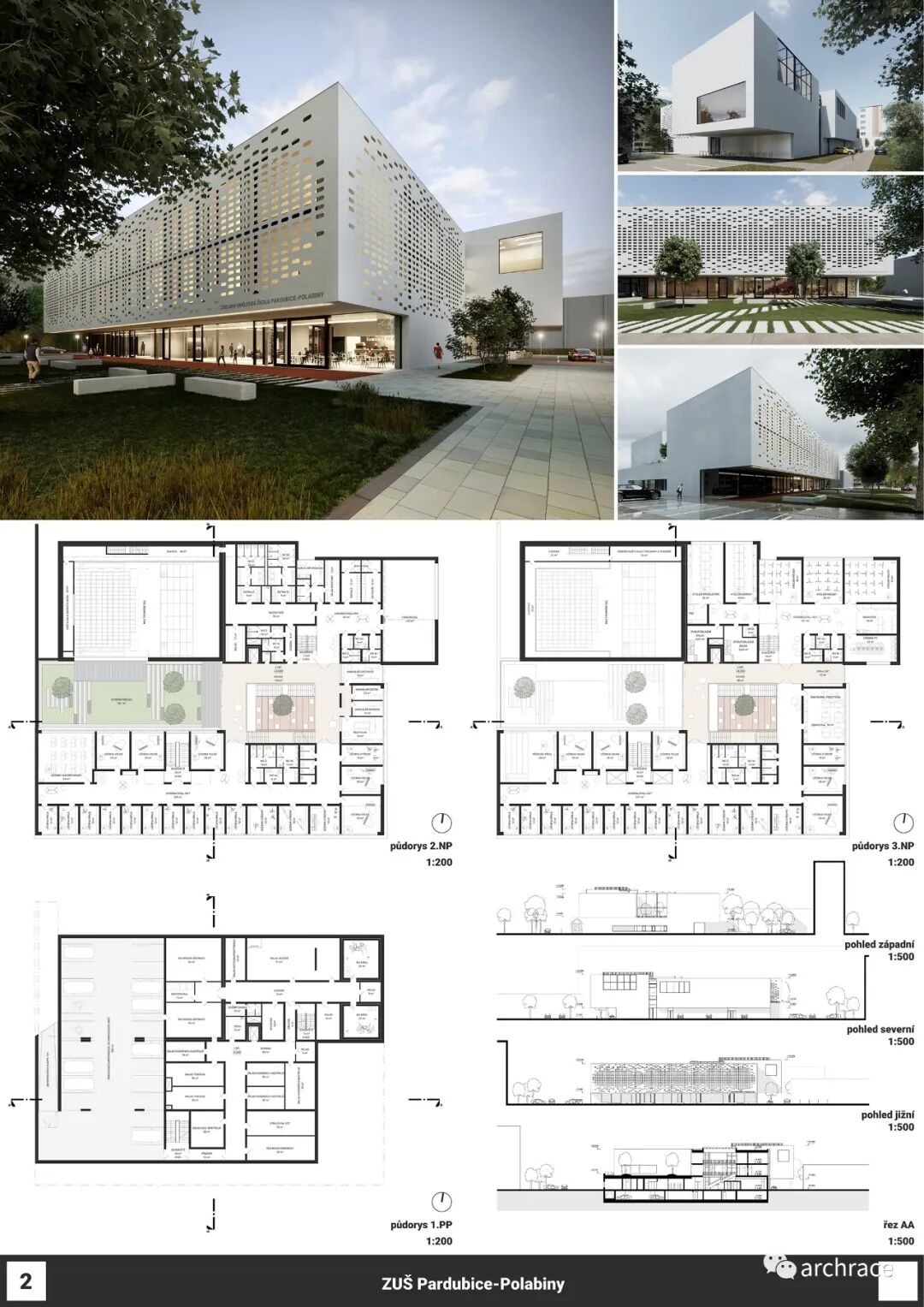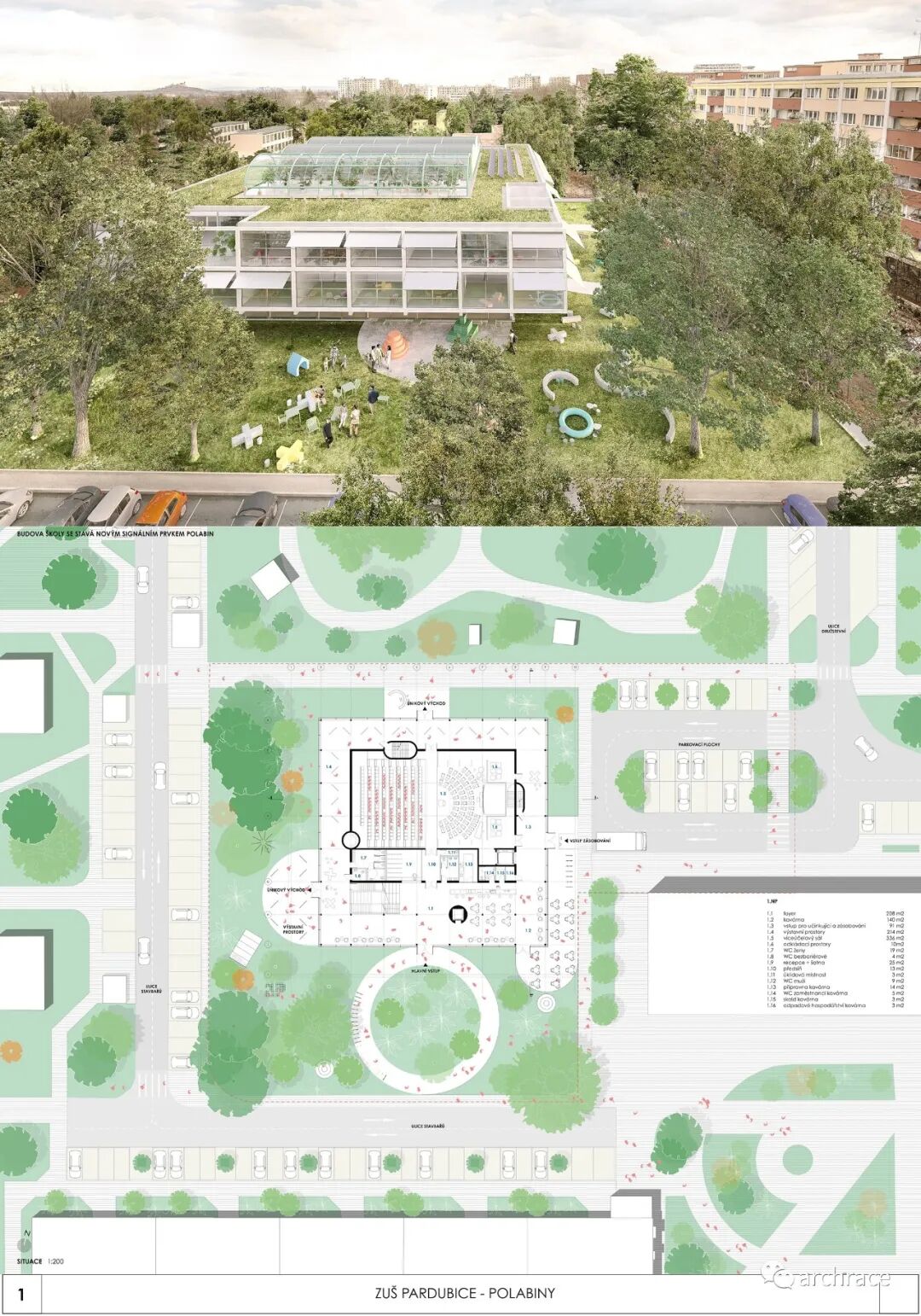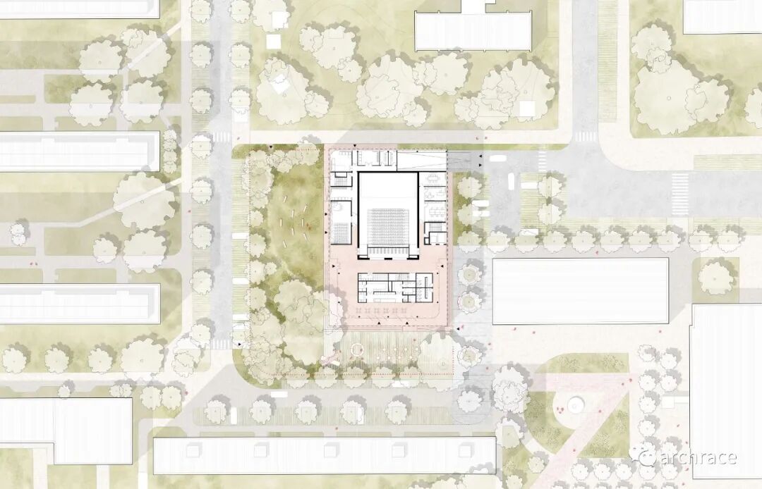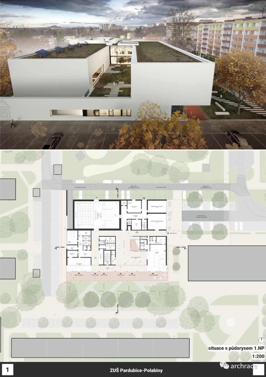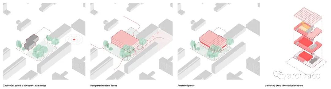 竞赛背景情况 捷克帕尔杜比斯艺术学校(ZUŠ Pardubice-Polabiny)最初是在帕尔杜比斯市 Havlíčková 街的前 LŠU 的一个分支机构。学校于1968年2月2日首次投入运营,从 那时候开始一直到今天,帕尔杜比斯艺术学校仍然是作为一所独立机构。最初,学校只教授音乐、舞蹈和视觉艺术,从1971年2月4日起,文学和戏剧专业也开始对学生开放 在这些领域,学校为选定的孩子提供适当艺术教育的基础知识,为才华横溢的学生准备在更高类型的艺术学校进行进一步的专业艺术学习。 目前,帕尔杜比斯艺术学校的教学分布在帕尔杜比斯 Polabiny 区内不同地点的四栋建筑中,这是建校以来该学校一直面临的一大挑战,学校从来没有为所有科目提供一个共同的教学场所。这种情况使个别学科和教师之间的合作以及学校的自然发展变得非常复杂。因此,学校决定新建一处新的学校建筑来容纳目前分散在各地的教学工作,并通过设计竞赛来征集设计方案。 新学校需要容纳 1,200 名学生的小学阶段的艺术教育,共分为4个学科——文学戏剧、视觉艺术、舞蹈、音乐。学校对于新建筑的设想是它应该成为帕尔杜比斯Polabiny 区的自然文化和社会中心,而不仅仅是只作为教育场所的学校。它应该对所有有小孩的家庭开放,而不是封闭和充满限制的。它还应该提供舒适以及具备与大型表演团体一起教学和表演的能力。新学校应该更广泛地使用新技术,还应该是所有教师之间交流讨论的场所。最后,它应该是一座美丽的建筑,能够让城市引以为豪,让所有人都会以身处其中而骄傲。 不久前竞赛结果公布,最终第一名空缺,来自捷克本土的建筑事务所 Studio Perspektiv 与 Grido, architektura a design 组成的团队、Med Pavlík architekti 并列赢得竞赛第二名。