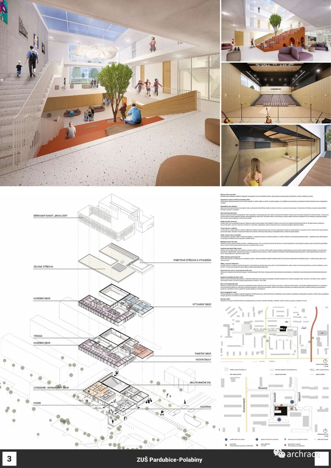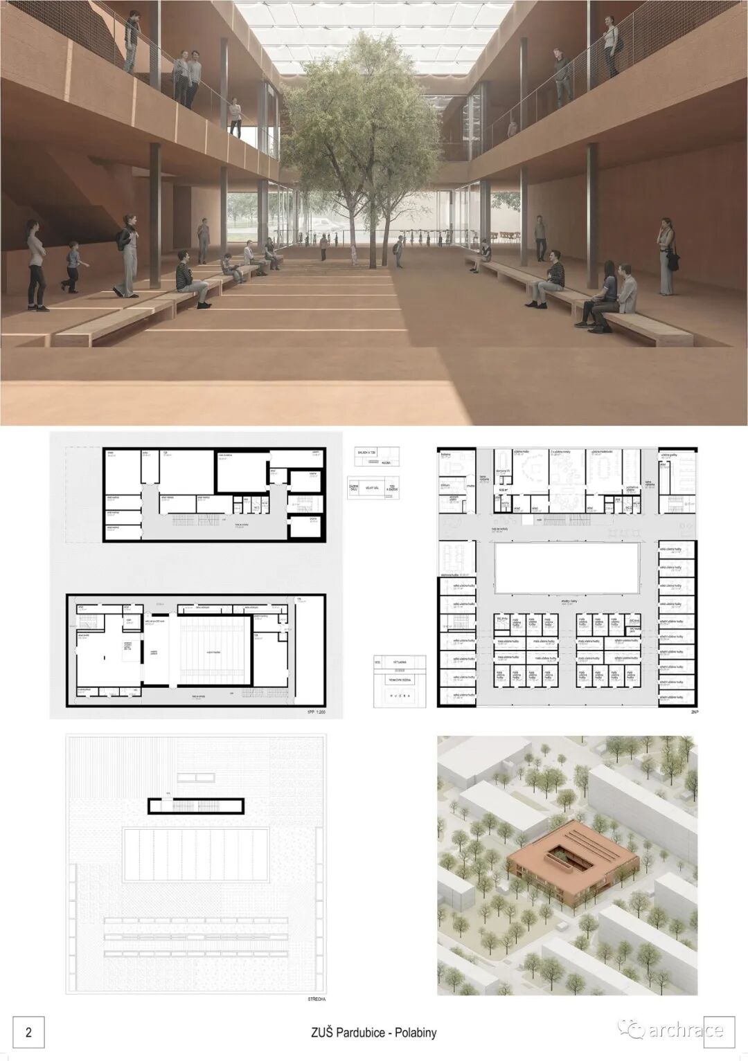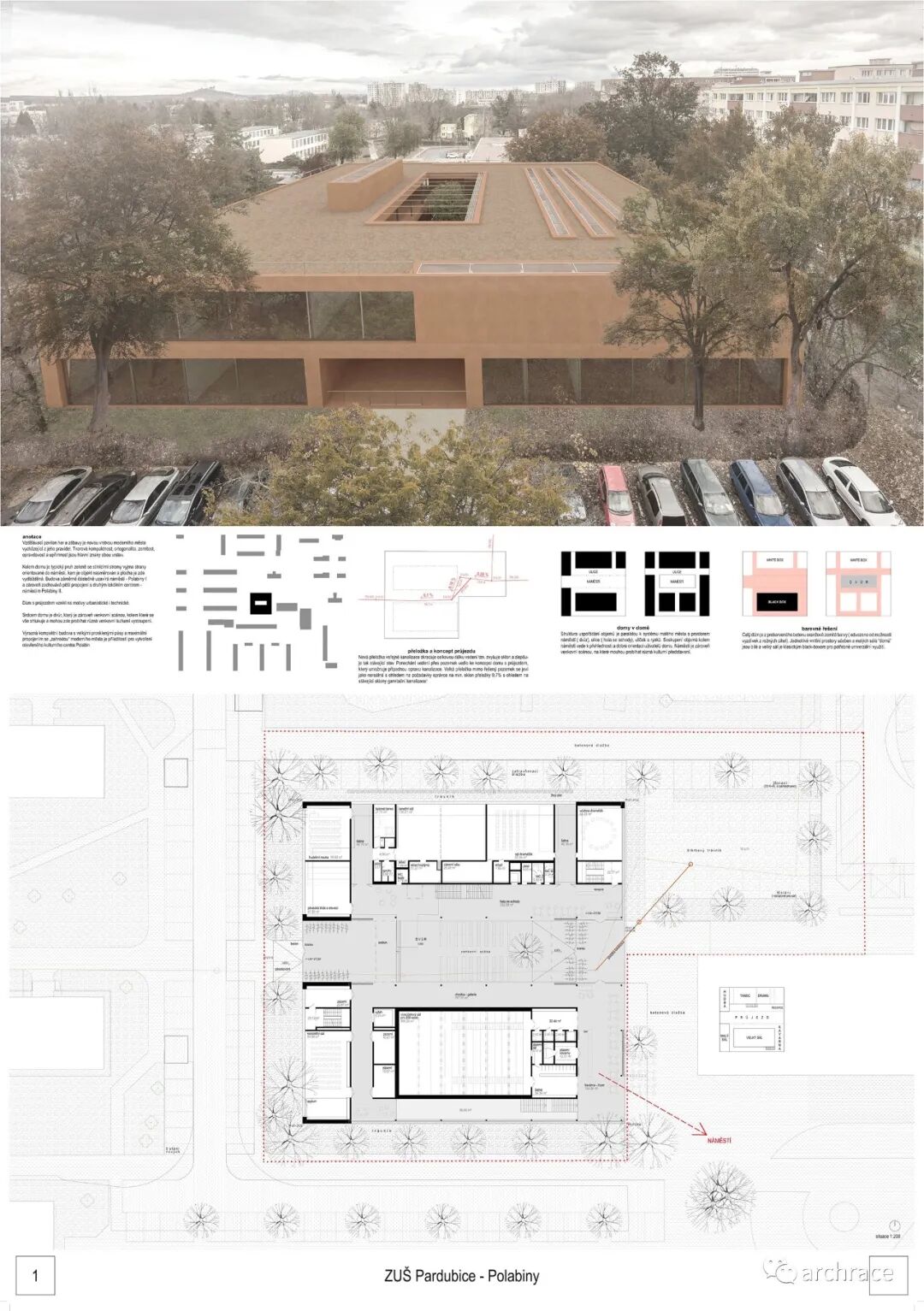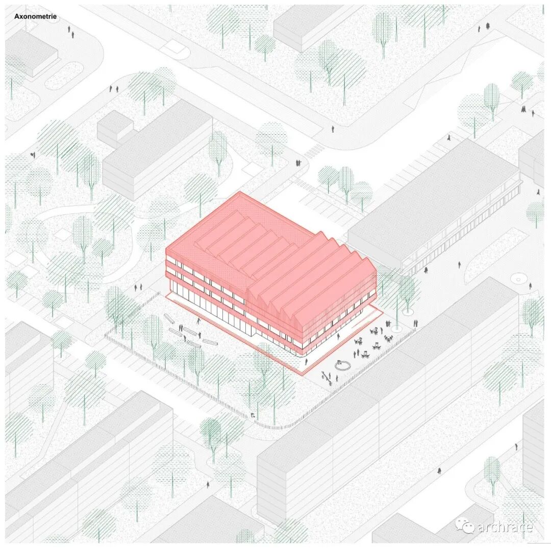 竞赛背景情况 捷克帕尔杜比斯艺术学校(ZUŠ Pardubice-Polabiny)最初是在帕尔杜比斯市 Havlíčková 街的前 LŠU 的一个分支机构。学校于1968年2月2日首次投入运营,从 那时候开始一直到今天,帕尔杜比斯艺术学校仍然是作为一所独立机构。最初,学校只教授音乐、舞蹈和视觉艺术,从1971年2月4日起,文学和戏剧专业也开始对学生开放 在这些领域,学校为选定的孩子提供适当艺术教育的基础知识,为才华横溢的学生准备在更高类型的艺术学校进行进一步的专业艺术学习。 目前,帕尔杜比斯艺术学校的教学分布在帕尔杜比斯 Polabiny 区内不同地点的四栋建筑中,这是建校以来该学校一直面临的一大挑战,学校从来没有为所有科目提供一个共同的教学场所。这种情况使个别学科和教师之间的合作以及学校的自然发展变得非常复杂。因此,学校决定新建一处新的学校建筑来容纳目前分散在各地的教学工作,并通过设计竞赛来征集设计方案。 新学校需要容纳 1,200 名学生的小学阶段的艺术教育,共分为4个学科——文学戏剧、视觉艺术、舞蹈、音乐。学校对于新建筑的设想是它应该成为帕尔杜比斯Polabiny 区的自然文化和社会中心,而不仅仅是只作为教育场所的学校。它应该对所有有小孩的家庭开放,而不是封闭和充满限制的。它还应该提供舒适以及具备与大型表演团体一起教学和表演的能力。新学校应该更广泛地使用新技术,还应该是所有教师之间交流讨论的场所。最后,它应该是一座美丽的建筑,能够让城市引以为豪,让所有人都会以身处其中而骄傲。 不久前竞赛结果公布,最终第一名空缺,来自捷克本土的建筑事务所 Studio Perspektiv 与 Grido, architektura a design 组成的团队、Med Pavlík architekti 并列赢得竞赛第二名。