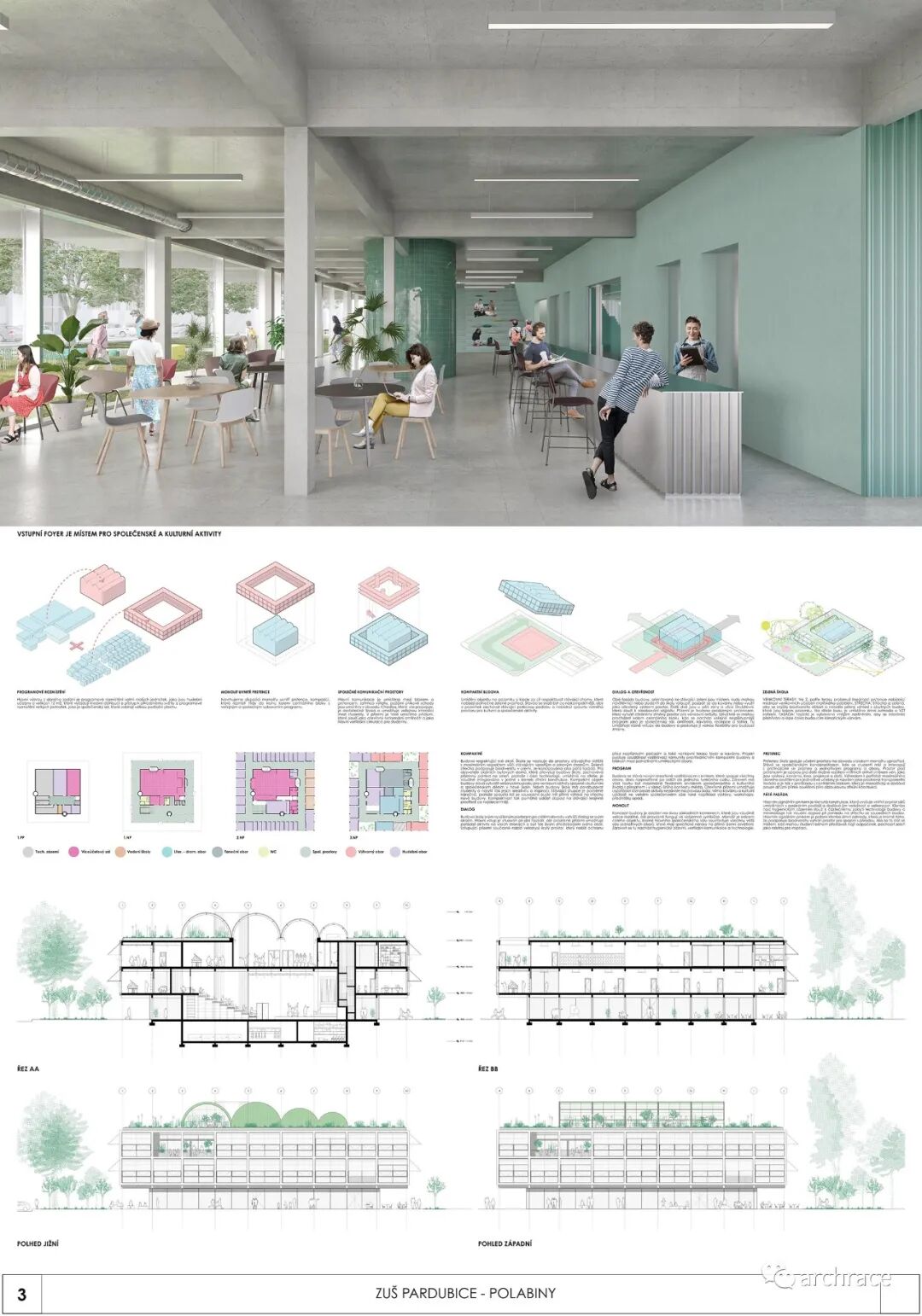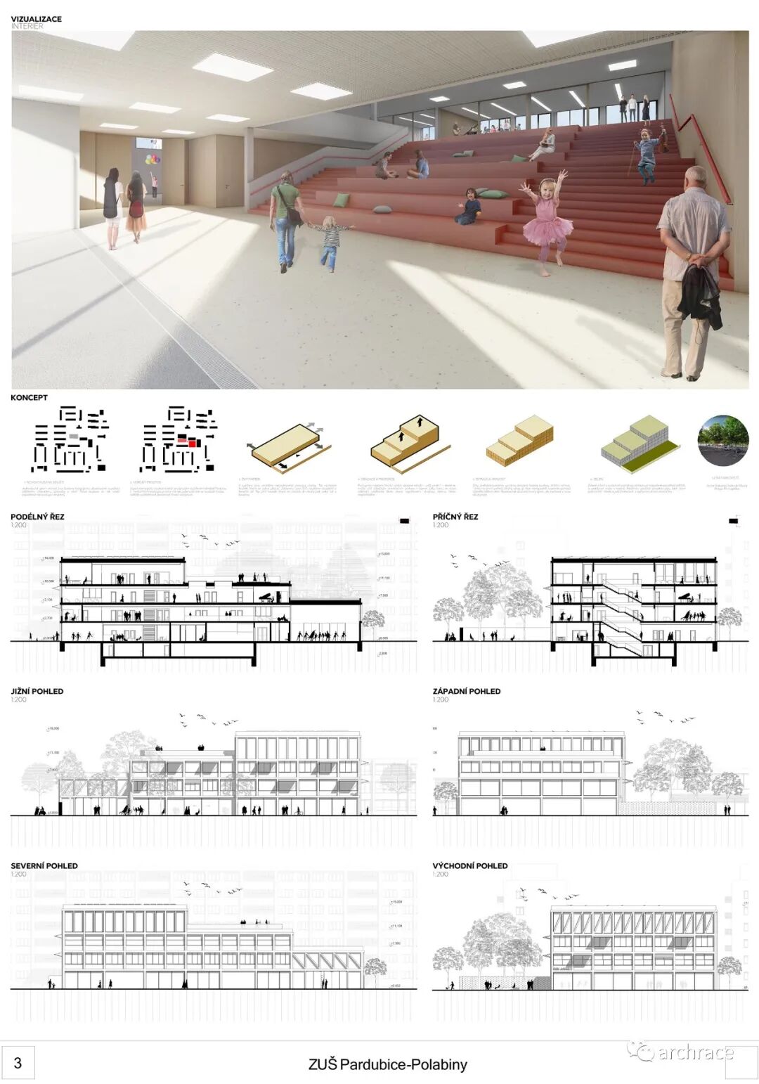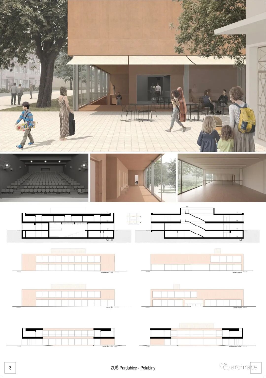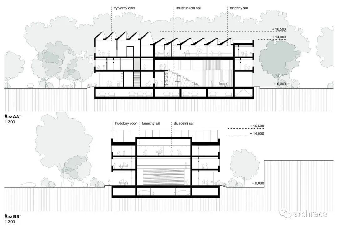 竞赛背景情况 捷克帕尔杜比斯艺术学校(ZUŠ Pardubice-Polabiny)最初是在帕尔杜比斯市 Havlíčková 街的前 LŠU 的一个分支机构。学校于1968年2月2日首次投入运营,从 那时候开始一直到今天,帕尔杜比斯艺术学校仍然是作为一所独立机构。最初,学校只教授音乐、舞蹈和视觉艺术,从1971年2月4日起,文学和戏剧专业也开始对学生开放 在这些领域,学校为选定的孩子提供适当艺术教育的基础知识,为才华横溢的学生准备在更高类型的艺术学校进行进一步的专业艺术学习。 目前,帕尔杜比斯艺术学校的教学分布在帕尔杜比斯 Polabiny 区内不同地点的四栋建筑中,这是建校以来该学校一直面临的一大挑战,学校从来没有为所有科目提供一个共同的教学场所。这种情况使个别学科和教师之间的合作以及学校的自然发展变得非常复杂。因此,学校决定新建一处新的学校建筑来容纳目前分散在各地的教学工作,并通过设计竞赛来征集设计方案。 新学校需要容纳 1,200 名学生的小学阶段的艺术教育,共分为4个学科——文学戏剧、视觉艺术、舞蹈、音乐。学校对于新建筑的设想是它应该成为帕尔杜比斯Polabiny 区的自然文化和社会中心,而不仅仅是只作为教育场所的学校。它应该对所有有小孩的家庭开放,而不是封闭和充满限制的。它还应该提供舒适以及具备与大型表演团体一起教学和表演的能力。新学校应该更广泛地使用新技术,还应该是所有教师之间交流讨论的场所。最后,它应该是一座美丽的建筑,能够让城市引以为豪,让所有人都会以身处其中而骄傲。 不久前竞赛结果公布,最终第一名空缺,来自捷克本土的建筑事务所 Studio Perspektiv 与 Grido, architektura a design 组成的团队、Med Pavlík architekti 并列赢得竞赛第二名。