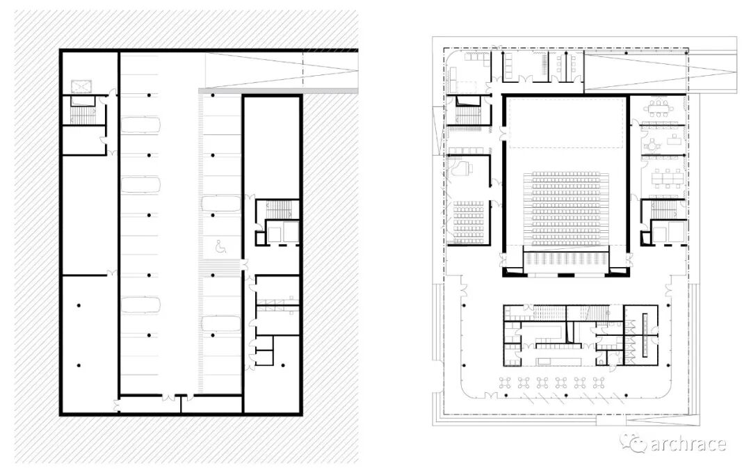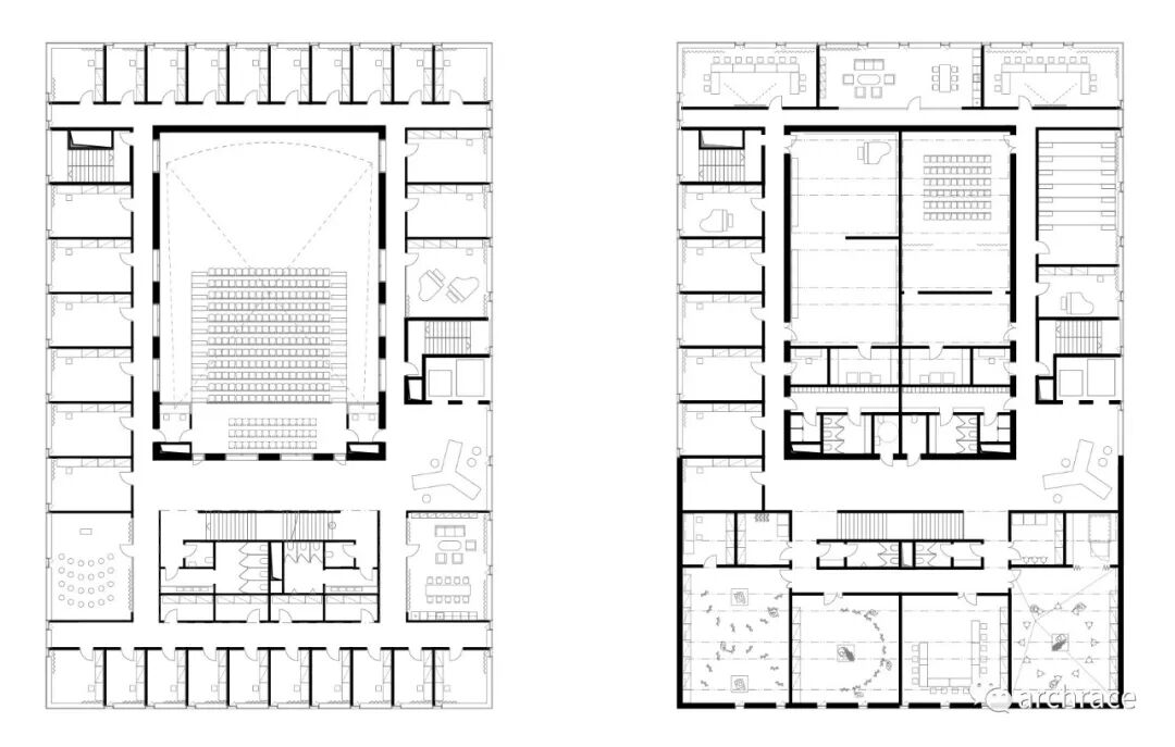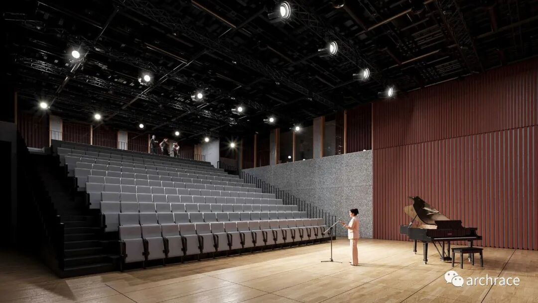 艺术学校的主要教学用房位于二层及以上,这可以利用周围的生活环境,真正发挥社区空间的作用。因此,该建筑的底层可以向社会出租用于其它用途,在功能上独立于艺术学校存在。全玻璃幕墙能够让当地人或路人可以看到建筑内部正在发生的事件。其中一个排练厅可以通向内部花园,那里有一个室外观众席。因此,建筑内部和外部之间的边界实际上是不存在的。咖啡馆前面的空间被设计成一个平静的区域,花园与广场被自然地融合在一起。