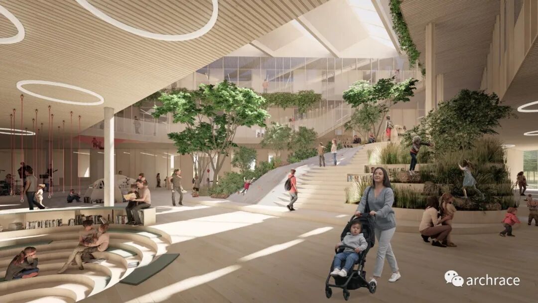 竞赛背景情况 本月,荷兰建筑事务所 NEXT architects 和 Christensen & Co architects 宣布赢得了为乌得勒支新 Cartesius 区设计的可持续发展儿童中心竞赛。该项目将小学、日托中心和体育馆结合在一个紧凑且融入自然的建筑内,围绕着一个绿色的核心呈流动的螺旋流线布局。 Cartesius 社区位于乌得勒支市中心,新建的可持续发展儿童中心强调健康的生活方式和生活环境是设计的核心。在儿童中心内部的螺旋流线中,所有功能围绕中心的绿色庭院组织。这是一个可持续和紧凑的设计,具有未来价值,将在绿色 Cartesius 社区中发挥积极作用。此外,项目展现了中小学、日托中心和体育馆既可以独立运作,但也位于同一个建筑内的姿态。