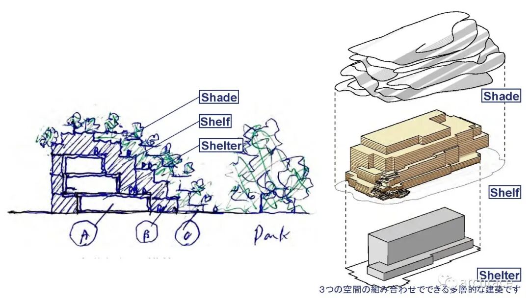 该方案将建筑的中央核心部分放置了书库和藏品库,在其周边形成了开放空间,使之协调。通过将中间区域的部分立体化,人们在公园的活动经过建筑的外围开放空间无缝连接了起来。