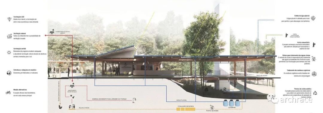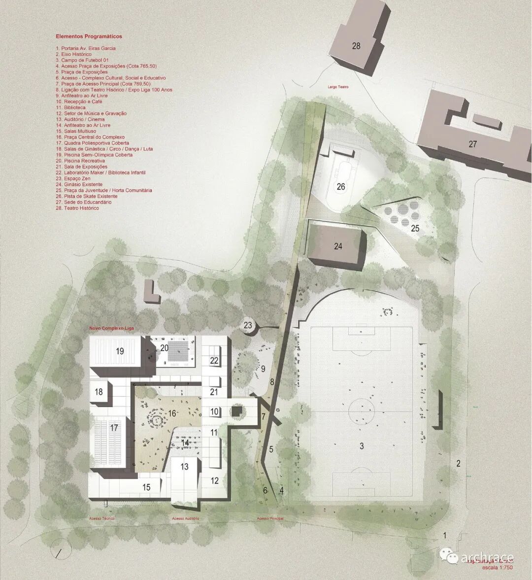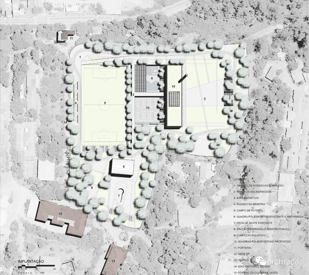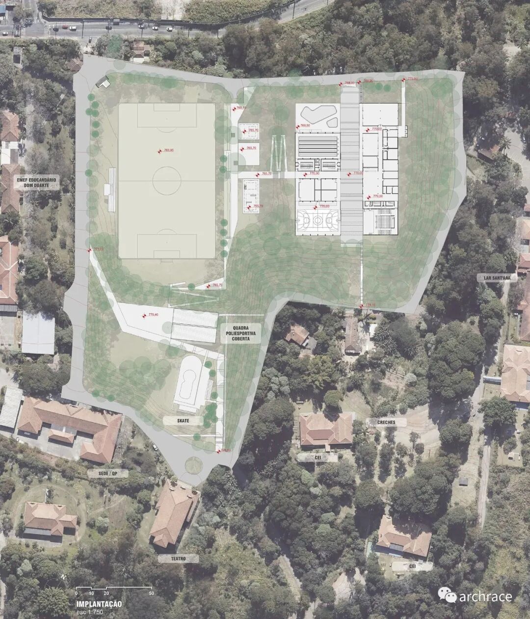 竞赛背景情况 去年12月12日,来自巴西的民间社会组织团结联盟(Liga Solidária)宣布了他们与巴西建筑学院(IED)合作开展新文化、社会和体育综合体建筑竞赛的结果。圣保罗当地的建筑工作室 Atelier Daniel Corsi 赢得第一名。 团结联盟是巴西的一个民间社会组织,于1923年在巴西圣保罗成立,该组织的信念是如果我们能够将爱、行动和团结结合起来,我们就能建立一个拥有更多机会和更公平的社会。今年团结联盟将迎来100岁生日,目前每年有20,000人得到了该组织帮助。为了庆祝百年纪念日并进一步扩大这一组织的社会行动,在去年8月发起了竞赛,创建一个新的文化、社会和体育综合体建筑,以促进体育、休闲、文化和为受助社区提供新的机会。 新综合建筑将建在 Educandário Dom Duarte (EDD),这是一个位于圣保罗西部 Raposo Tavares 区的团结联盟的办事机构。建筑选址的用地面积是460,000平方米,场地内树木繁茂,与大自然联系紧密,此外周边还有被圣保罗市历史、文化和环境遗产保护委员会列为保护名单的历史建筑。 竞赛有来自巴西各地的61个建筑设计团队参加,入围竞赛最后阶段的共有三个团队。三个入围团队参与了与当地社区的互动并展示项目,听取了社区民众对于新的建筑的期待,并确保他们有融入这项活动的参与感。
