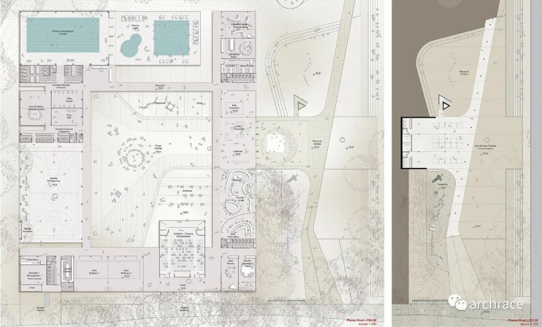 获胜提案是一个理解并融入团结联盟组织宗旨的提案,包括其植入的新建筑与现有设施之间的连接关系的处理上,这让该提案在入围作品中脱颖而出。除了在建筑功能的布置上呈现出良好的布局,该提案还注重了与场地地形的结合。由于强调建筑的水平性和创建内部封闭庭院的策略,保持了整个综合体的具备足够的规模,并保障了青少年进行体育活动时的安全。