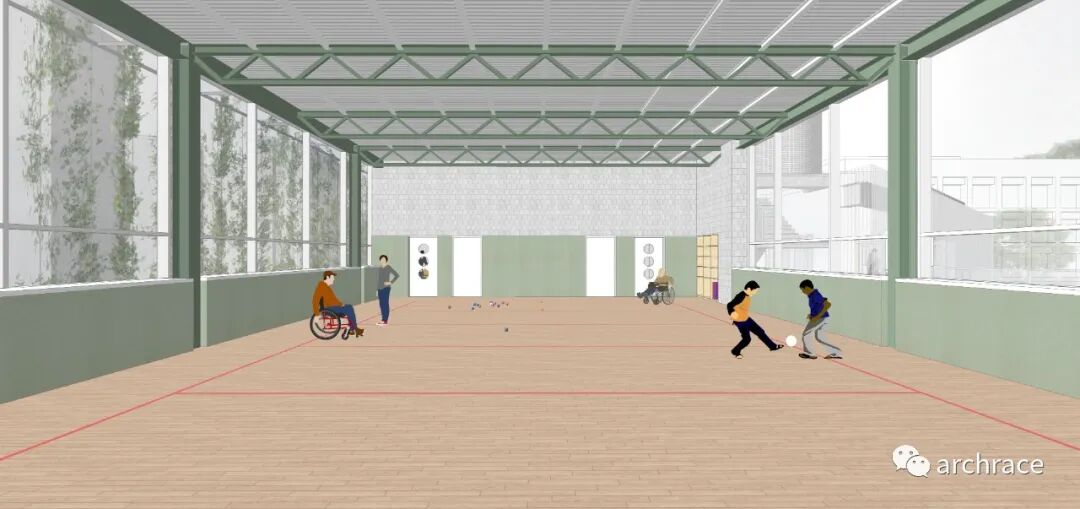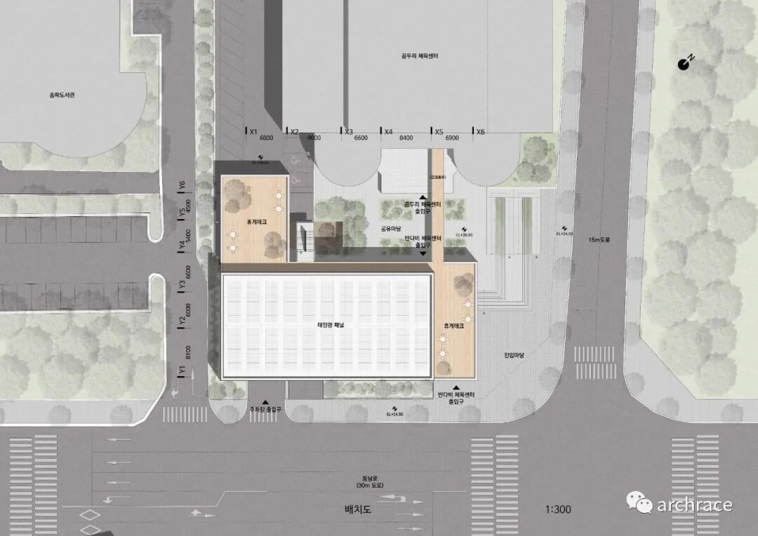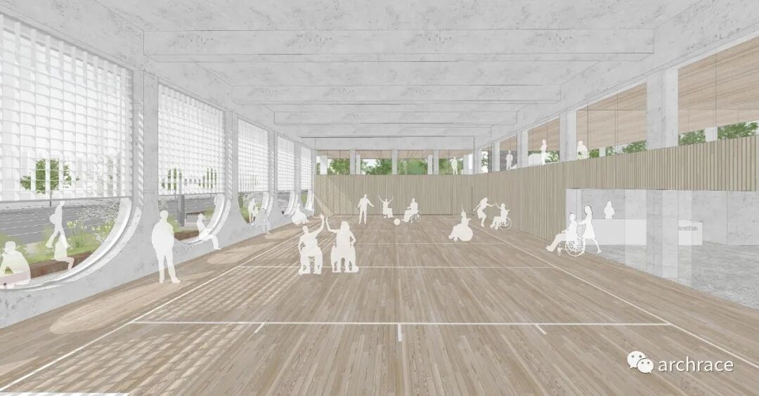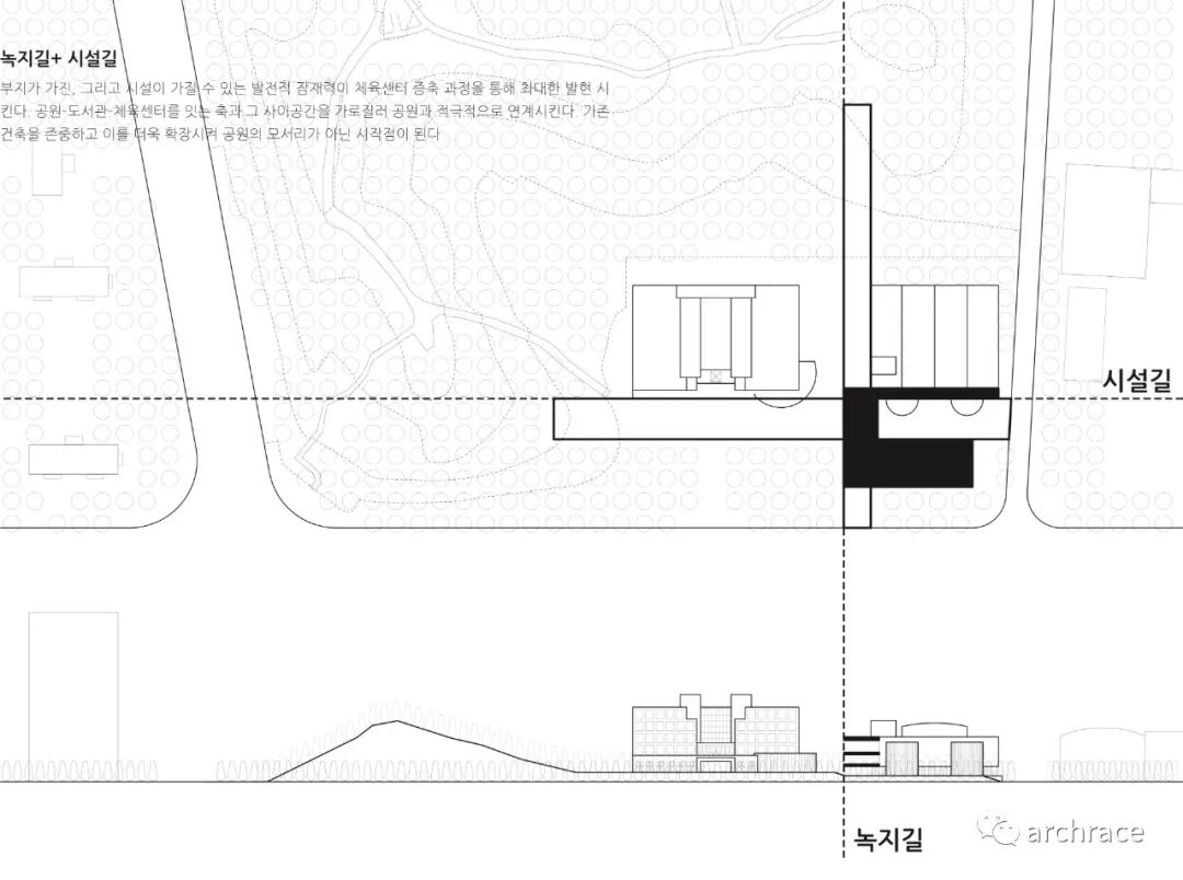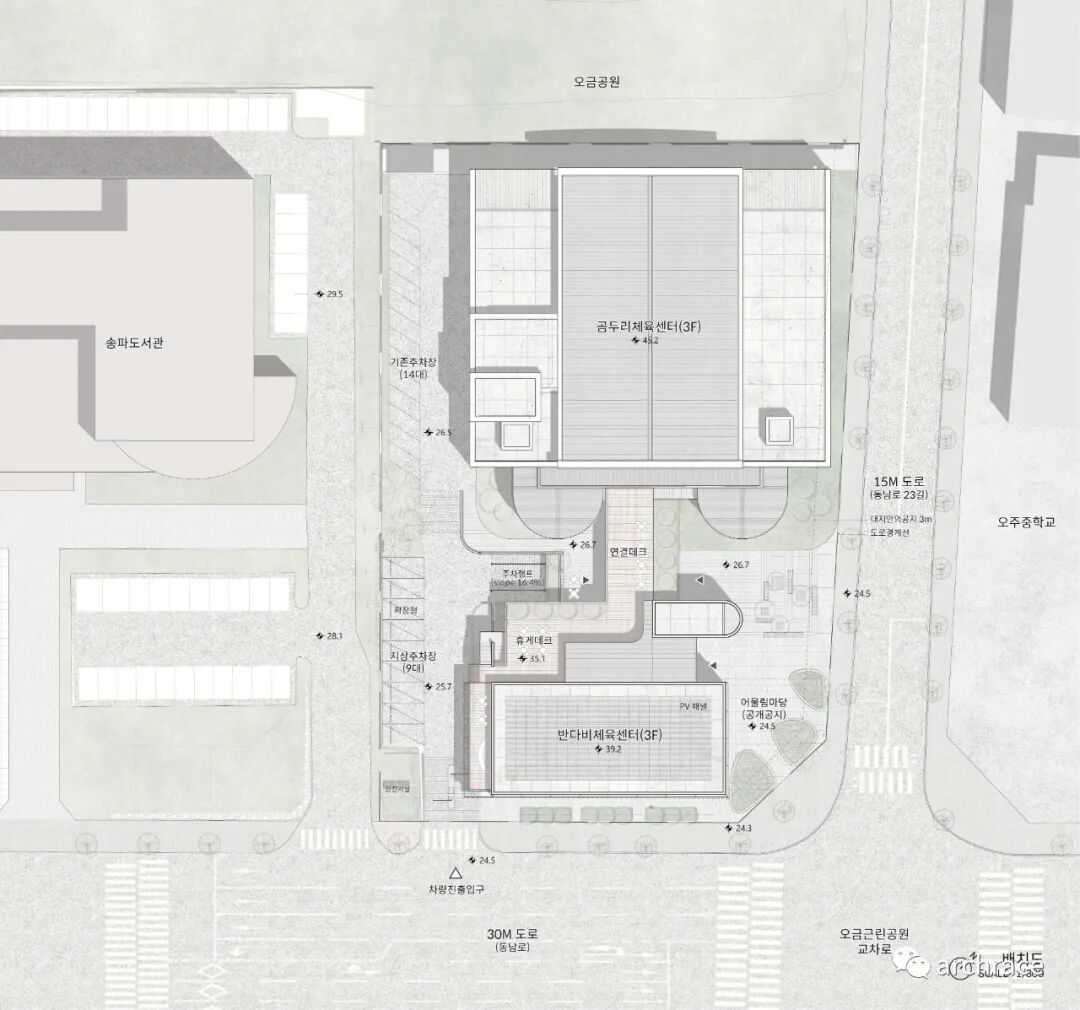 竞赛背景情况 首尔市政府的城市空间规划处在今年的10月17日发布了首尔 Bandabi 体育中心扩建设计竞赛,Bandabi 是2018年平昌冬季残奥会吉祥物,形象为亚洲黑熊,代表2018年平昌冬季残奥会的精神,向世界民众传递残奥会的愿景与价值。 竞赛发起的背景是: • 该项目旨在根据政府促进残疾人体育运动的计划,建立为残疾人提供个性化服务的设施。 • 目前的首尔贡多里体育中心是首尔东南部唯一的残疾人体育设施,已经过时,需要升级设施。 • 原体育中心缺乏停车场导致民事投诉被频繁提出,迫切需要建立地下停车位。 • 鼓励残疾人参加体育活动,从而减少他们的医疗支出,提高他们的生活质量。 竞赛共收到50多份参赛提案,经过第一轮筛选之后,选出了5个作品进入第二轮。最终由来自韩国釜山的建筑事务所 Ahnmok Architects 赢得了竞赛第一名,他们提出的设计提案中在一层布置了运动设施的优点,通过外部空间设计以及入口大厅实现与现有建筑的衔接,同时在形式语言与现有建筑之间的契合度也得到了评委们的高度评价。