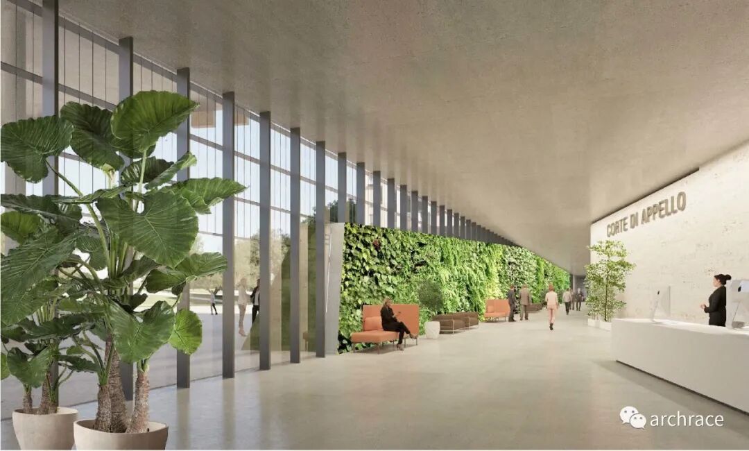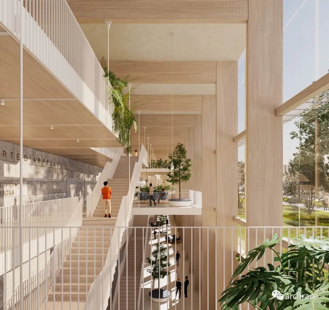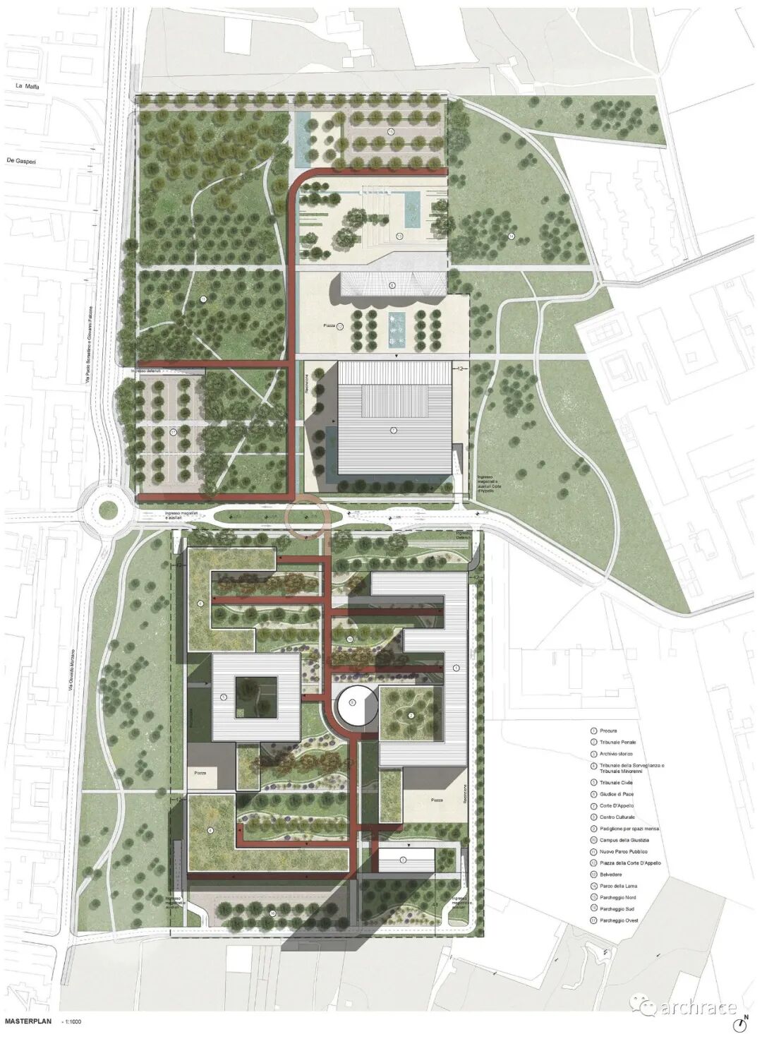 因此,该项目的第一个设计动作是创建绿色公园,这符合增加城市绿化进程的需要,以丰富和整合当地的生物多样性,并在城市内创造一个大型公共空间,成为新区的枢纽和引力中心,以及联系周边地区的桥梁。在这种原始的环境中结合了新的司法办公大楼,它不是一个简单的司法行政所在地,而是一个“活跃”地区的催化剂和驱动因素,为所有用户提供服务和开放空间,此外,该区域贯通南北的自行车道构成了通往为司法办公大楼设计的功能区的另一个门户。
