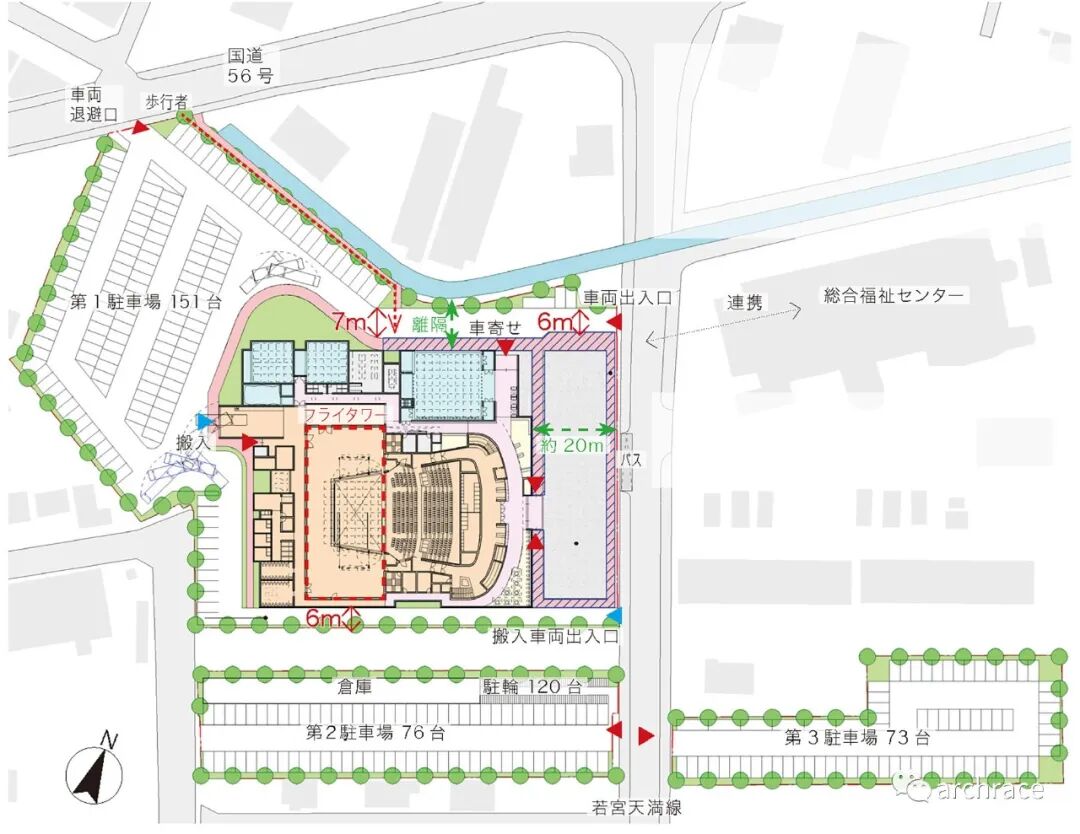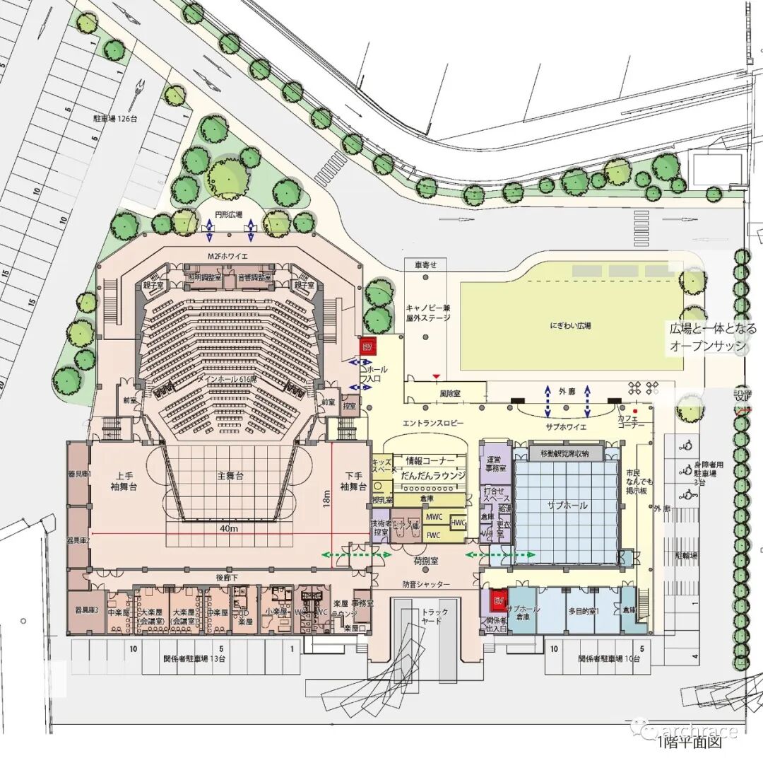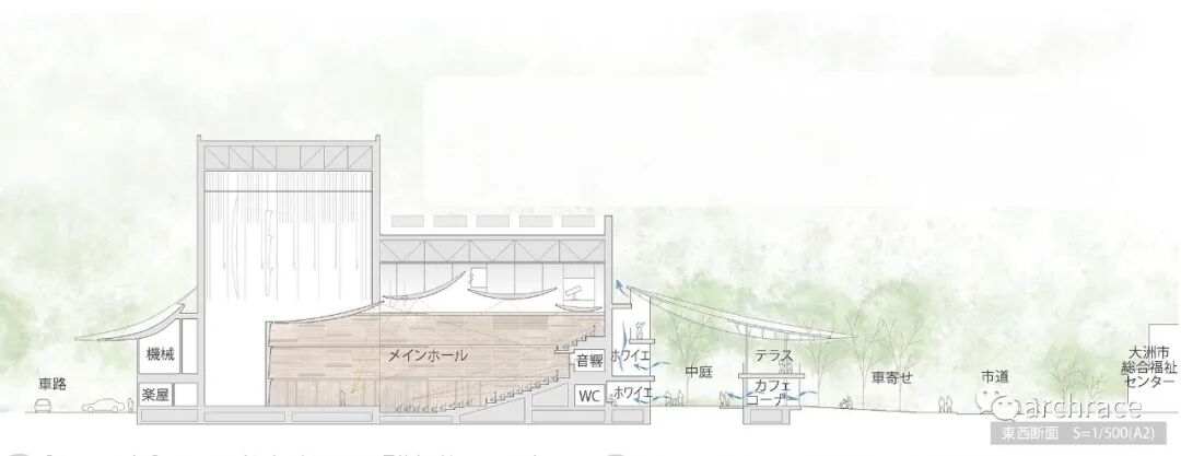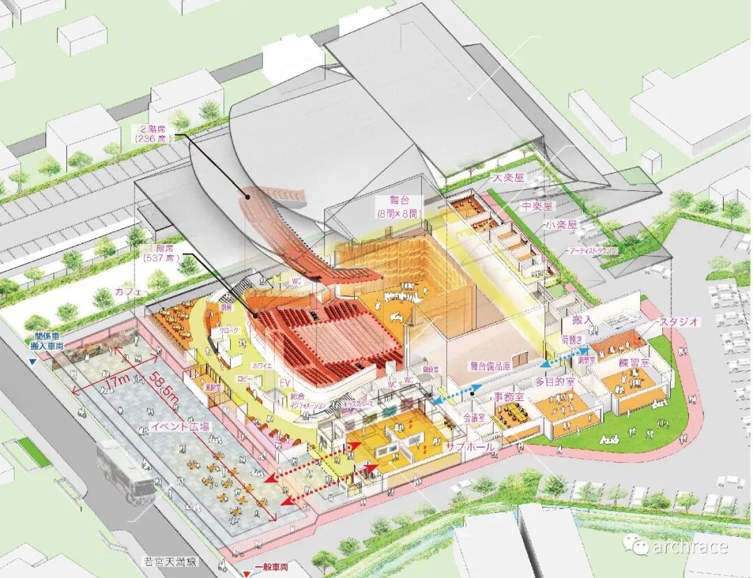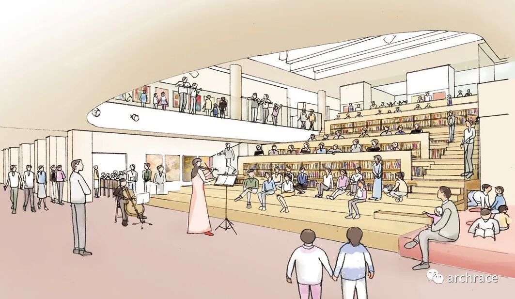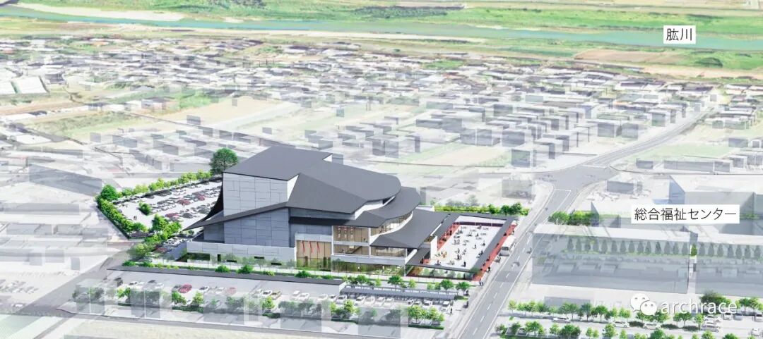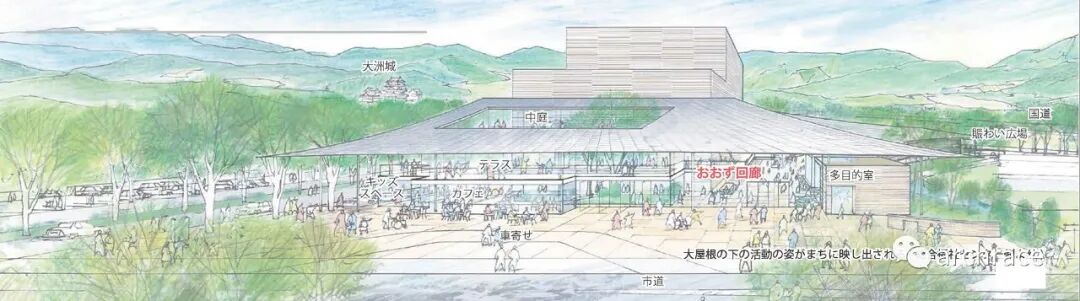 竞赛背景情况 日本大洲市位于爱媛县南予地方,它虽然被称为市,但其实十分具有乡间田园的风貌,城市历史更不逊于京都,有着“伊予的小京都”之称,是日本一处著名的旅游胜地。 大洲市市民会馆始建于1968年,自1969年开馆以来,作为该市的文化、艺术中心受到了当地很多市民的喜爱。但是,市民会馆经历半个多世纪的使用,其建筑结构、设备等性能已趋于老化。2021年7月,大洲市提出了《新的大洲市民文化会馆整备基本构想》,制定了对现有建筑进行改扩建的计划,让市民会馆以新的面貌发挥文化设施,服务市民文化生活的作用。 去年11月,大洲市启动了一项设计竞赛,征集新市民会馆建筑的改扩建设计方案。设计方案需要在解决市民会馆所面临的课题的同时,能够在未来灵活、准确地应对多样化、高品质化的市民的文化艺术活动的需求,推进市民的日常交流和文化信息发布等功能。同时,为了实现脱碳目标,减少环境负荷大的公共建筑物的生命周期成本,新市民会馆还应该满足ZEB化(ZEB Ready)的认证。 今年3月23日,在经历了两个阶段的评审工作后,竞赛公布了结果,由株式会社佐藤総合計画赢得了第一名,评委们认为获胜方案是一个高度综合的提案,考虑了与周围具有“大洲特色”的环境之间的和谐。建筑各层的平面布置也考虑到了实用性和便利性,以中庭为核心的日常公共空间也得到了评委们的高度赞赏。此外,与ZEB认证相关的设计措施所体现的技术能力十分有效且具有高度可行性的。评委们对于方案中设计的所谓“大洲走廊”的空间,认为其不一定要着眼于交通的便捷性,扩大公共区域的吸引力可能会更好。此外关于大屋顶,评委们认为这虽然是该方案的一个重要特点,但未来可能会存在成本上的问题。