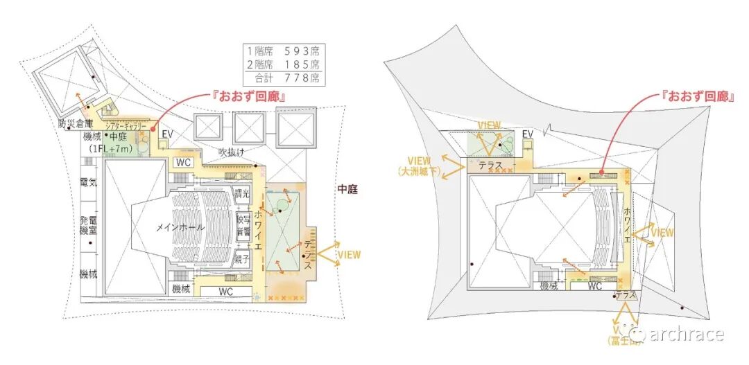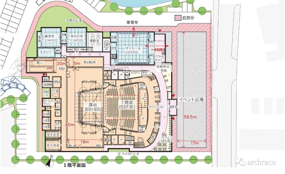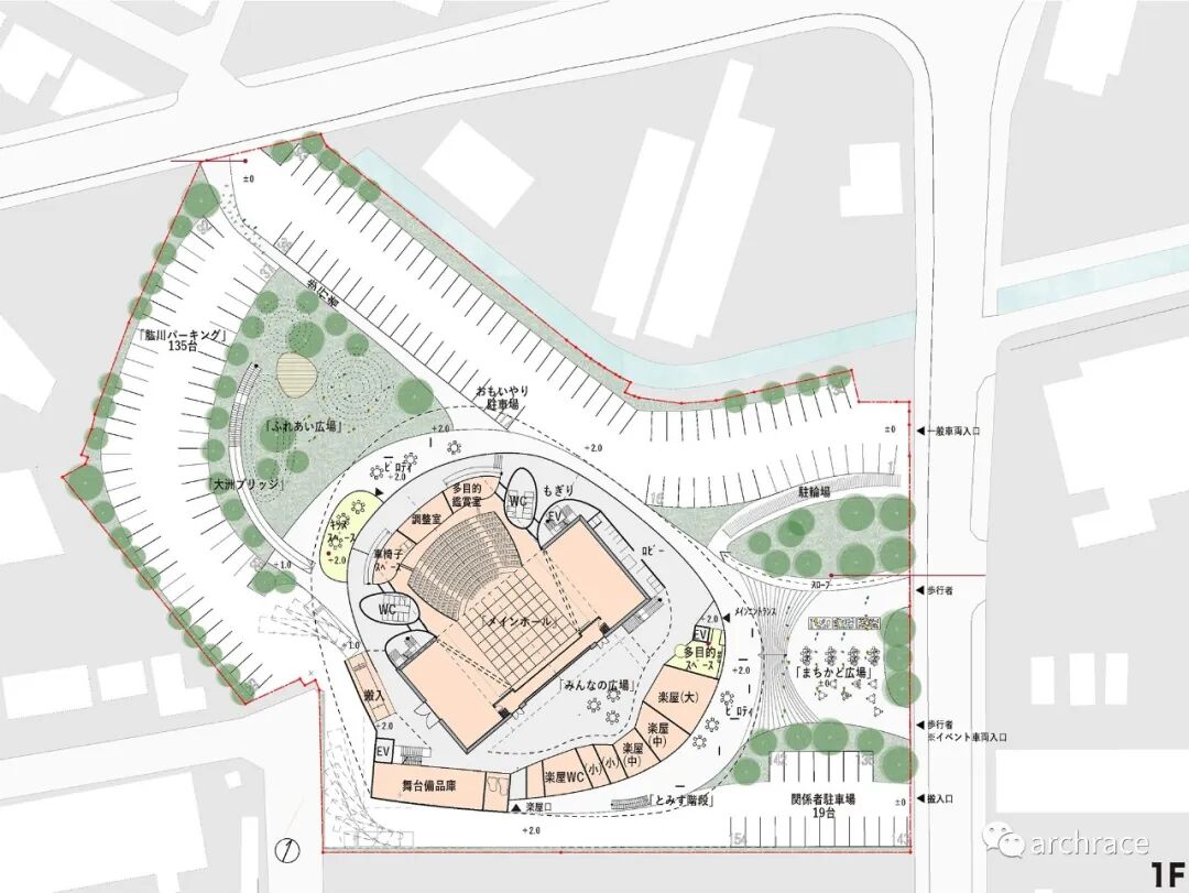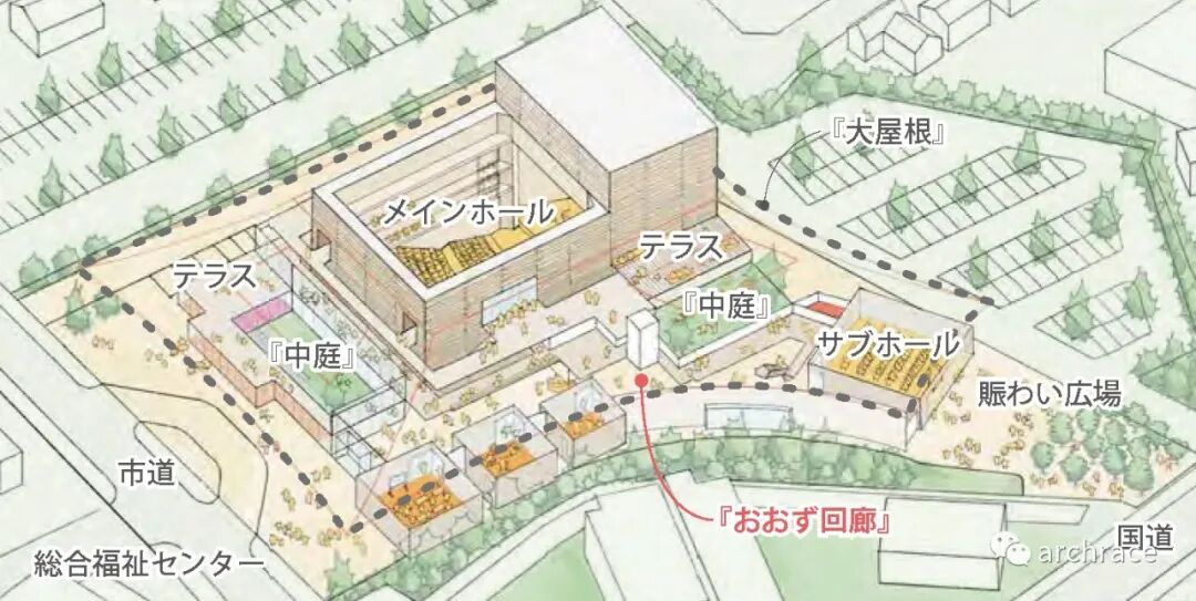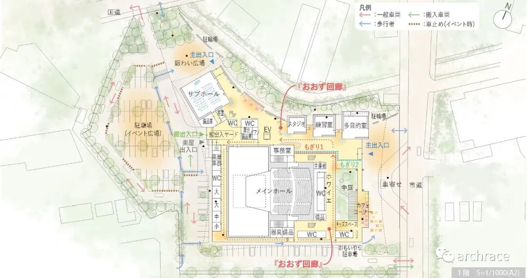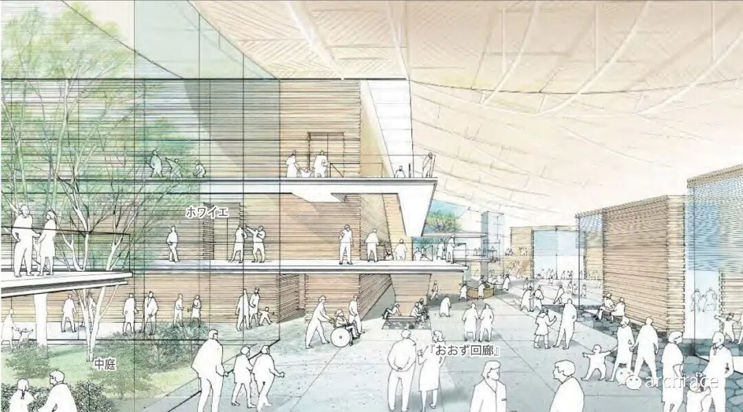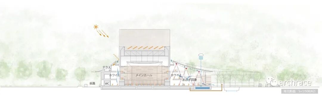 竞赛背景情况 日本大洲市位于爱媛县南予地方,它虽然被称为市,但其实十分具有乡间田园的风貌,城市历史更不逊于京都,有着“伊予的小京都”之称,是日本一处著名的旅游胜地。 大洲市市民会馆始建于1968年,自1969年开馆以来,作为该市的文化、艺术中心受到了当地很多市民的喜爱。但是,市民会馆经历半个多世纪的使用,其建筑结构、设备等性能已趋于老化。2021年7月,大洲市提出了《新的大洲市民文化会馆整备基本构想》,制定了对现有建筑进行改扩建的计划,让市民会馆以新的面貌发挥文化设施,服务市民文化生活的作用。 去年11月,大洲市启动了一项设计竞赛,征集新市民会馆建筑的改扩建设计方案。设计方案需要在解决市民会馆所面临的课题的同时,能够在未来灵活、准确地应对多样化、高品质化的市民的文化艺术活动的需求,推进市民的日常交流和文化信息发布等功能。同时,为了实现脱碳目标,减少环境负荷大的公共建筑物的生命周期成本,新市民会馆还应该满足ZEB化(ZEB Ready)的认证。 今年3月23日,在经历了两个阶段的评审工作后,竞赛公布了结果,由株式会社佐藤総合計画赢得了第一名,评委们认为获胜方案是一个高度综合的提案,考虑了与周围具有“大洲特色”的环境之间的和谐。建筑各层的平面布置也考虑到了实用性和便利性,以中庭为核心的日常公共空间也得到了评委们的高度赞赏。此外,与ZEB认证相关的设计措施所体现的技术能力十分有效且具有高度可行性的。评委们对于方案中设计的所谓“大洲走廊”的空间,认为其不一定要着眼于交通的便捷性,扩大公共区域的吸引力可能会更好。此外关于大屋顶,评委们认为这虽然是该方案的一个重要特点,但未来可能会存在成本上的问题。