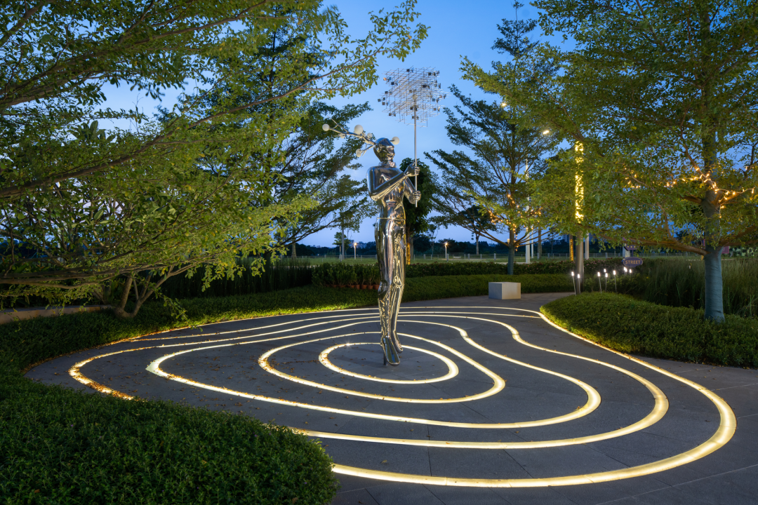 景观空间包括两个部分,前场商业外场与市政绿带一体化打造,作为未来交付保留区域,营造的舒适的林下空间,打造活力街角广场,给访客参与未来社区的的真实感受;后侧为样板庭院,以简单的路径和种植搭配,通过镜面装置的植入,营造无尽之森的奇幻感受。