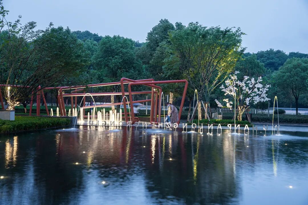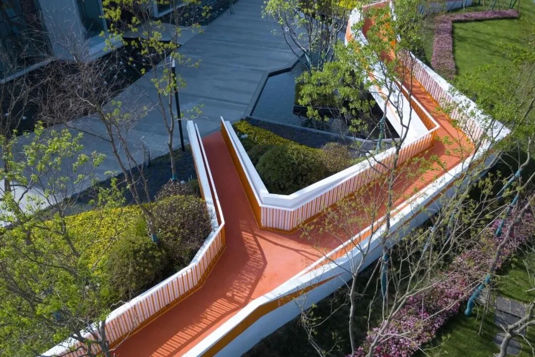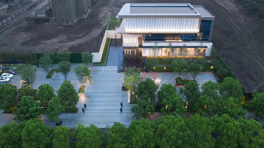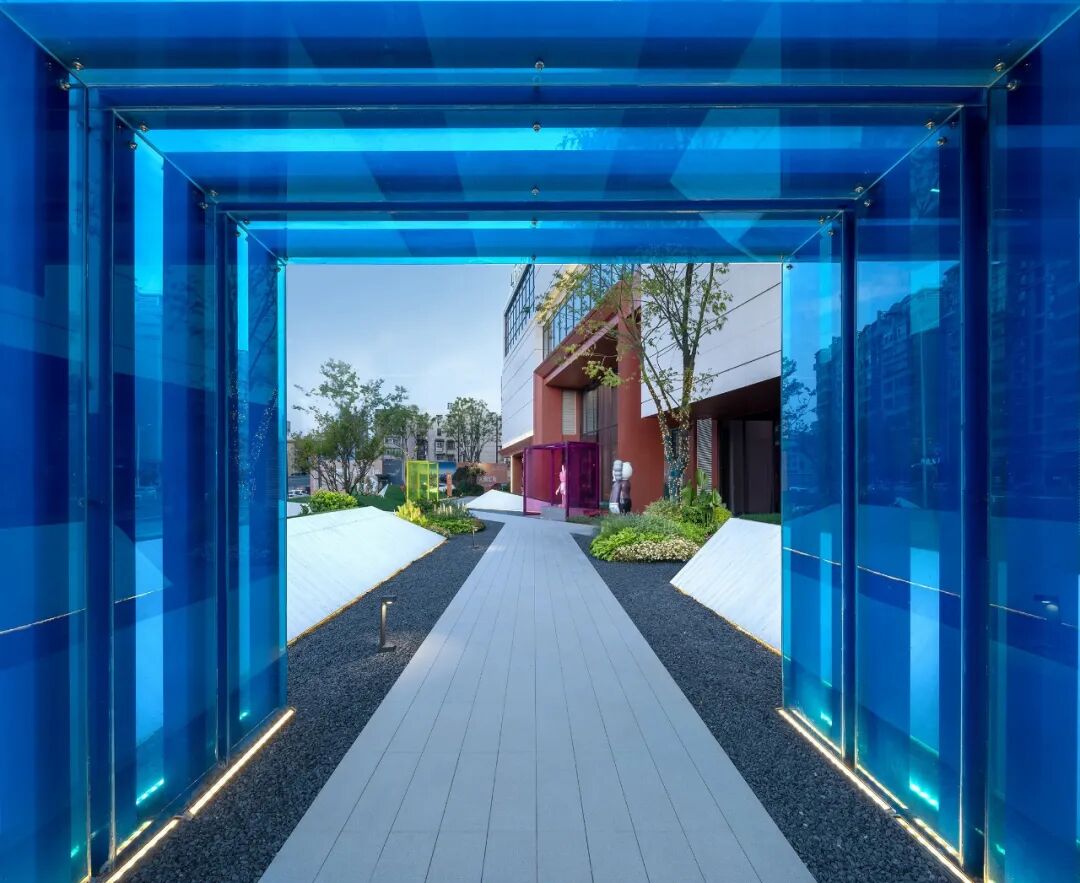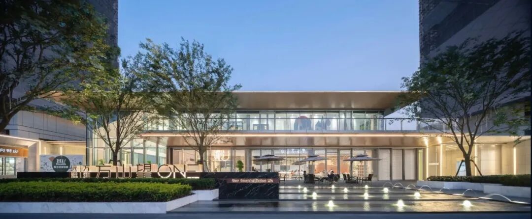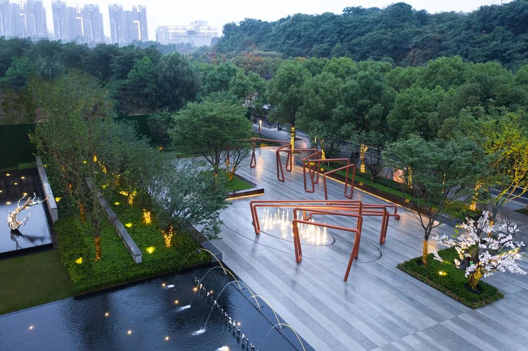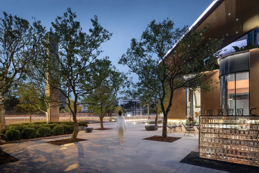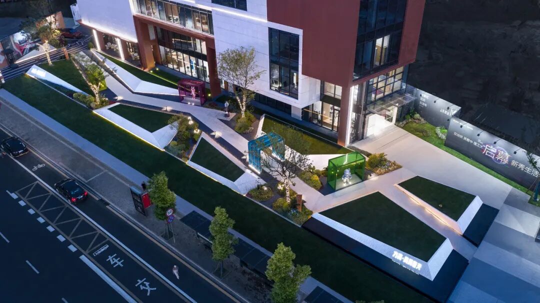 本案为观江樾项目东南街角的示范区,是一个社区生活广场街道,也是展示大区生活的舞台。设计将L形的商业空间设想为都市街角美学馆,设计以“江”为设计概念,将江河的景观延伸至场地,将整个空间打造为充满自然气息的生长型街角花园。