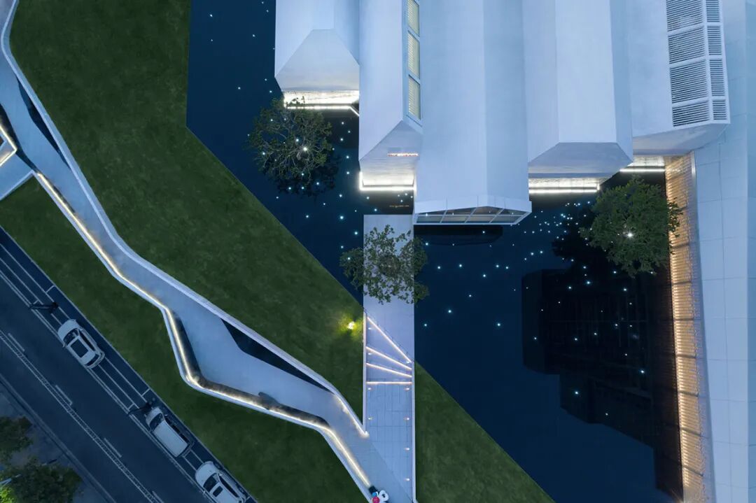 景观选择“退让”与“融入”,融入场地,划出消隐河谷,融入建筑,衬以无边之境,“河谷”、“山形”、"村头大树"、“星空”,巧妙的形成一个诗意的整体,一个承载美好憩居的未来感空间。