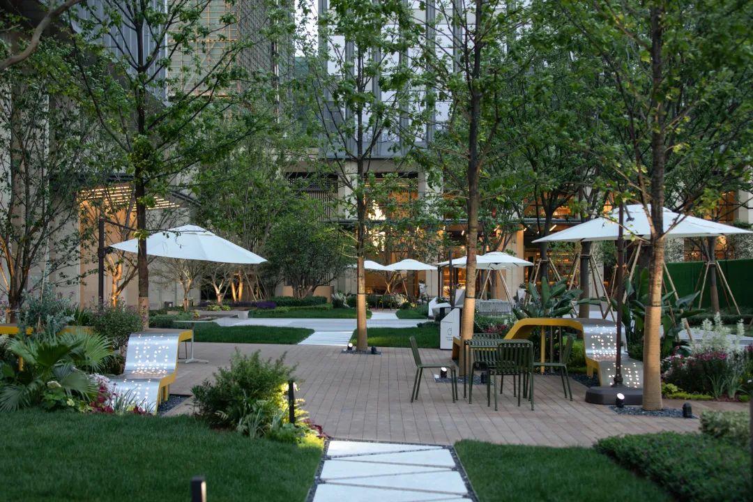 景观空间包括两个部分,前场商业外场与市政绿带一体化打造,作为未来交付保留区域,营造的舒适的林下空间,打造活力街角广场,给访客参与未来社区的的真实感受;后侧为样板庭院,以简单的路径和种植搭配,通过镜面装置的植入,营造无尽之森的奇幻感受。