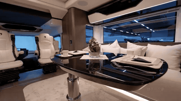 宽敞的三人座沙发,配备了可升降茶几。车厢一侧嵌入了50寸的电视机。