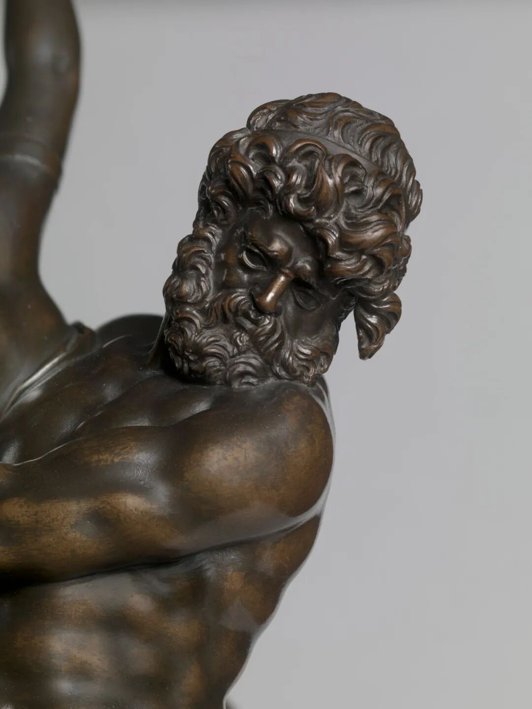 这件《劫掠得伊阿尼拉》描述的是,半人马涅索斯垂涎大力神赫拉克勒斯的妻子得伊阿尼拉,借口托她过河之际进行劫掠,他双手控制住挣扎的女人,在两只后腿保持重心的强劲支撑下,两只前腿呈对称姿势抬起向前跨越。