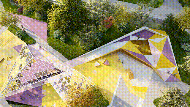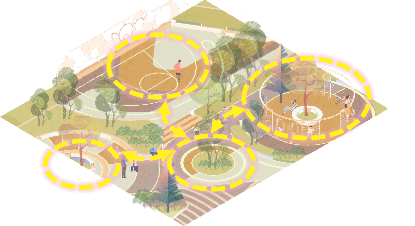 通过多条流动的、有触感的、艺术的线贯穿所有活动场地,将各个功能板块用纽带联系起来,打造有趣、连续的社区聚场。