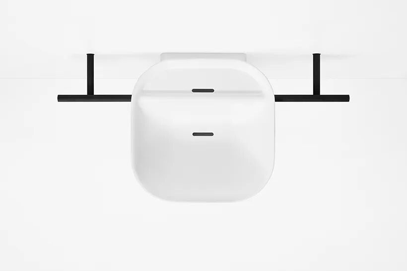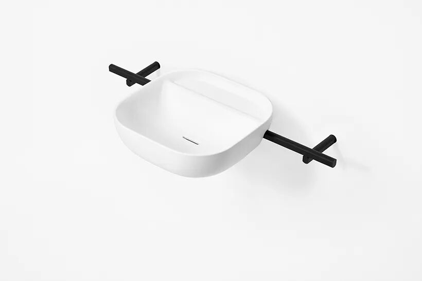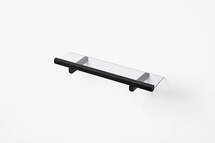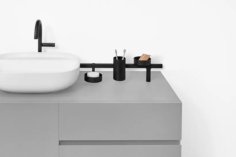 该系列中的尘盒有一个盖子,仅在两个支撑点上保持平衡,这意味着只需轻轻抬起一端即可打开,轻轻一按即可将其关闭。镜子也似乎挂在一根杆上. 杯子由高度透明的硅胶制成,由于表面平坦,易于堆叠和插入杯托。虽然它们看起来像玻璃,但它们像橡胶一样柔软,不会不小心掉落。皂液器也模仿基本形式,允许它们并排排列而不会产生间隙。通常随意放置在台面上的物品和配件通过设计自然而然地变得更有条理。