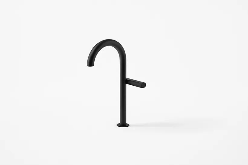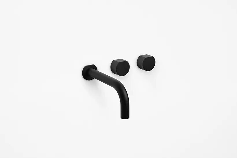 There are two types of faucets, standard and wall-mounted. The wall-mounted faucet with a detached set of handles ensures that the elements are visually matched because the faces are in alignment. Another wall-mounted model, where the spout and handle are attached, is designed to appear as if the handle is floating on the spout, creating a unified impression when placed near a bar.
