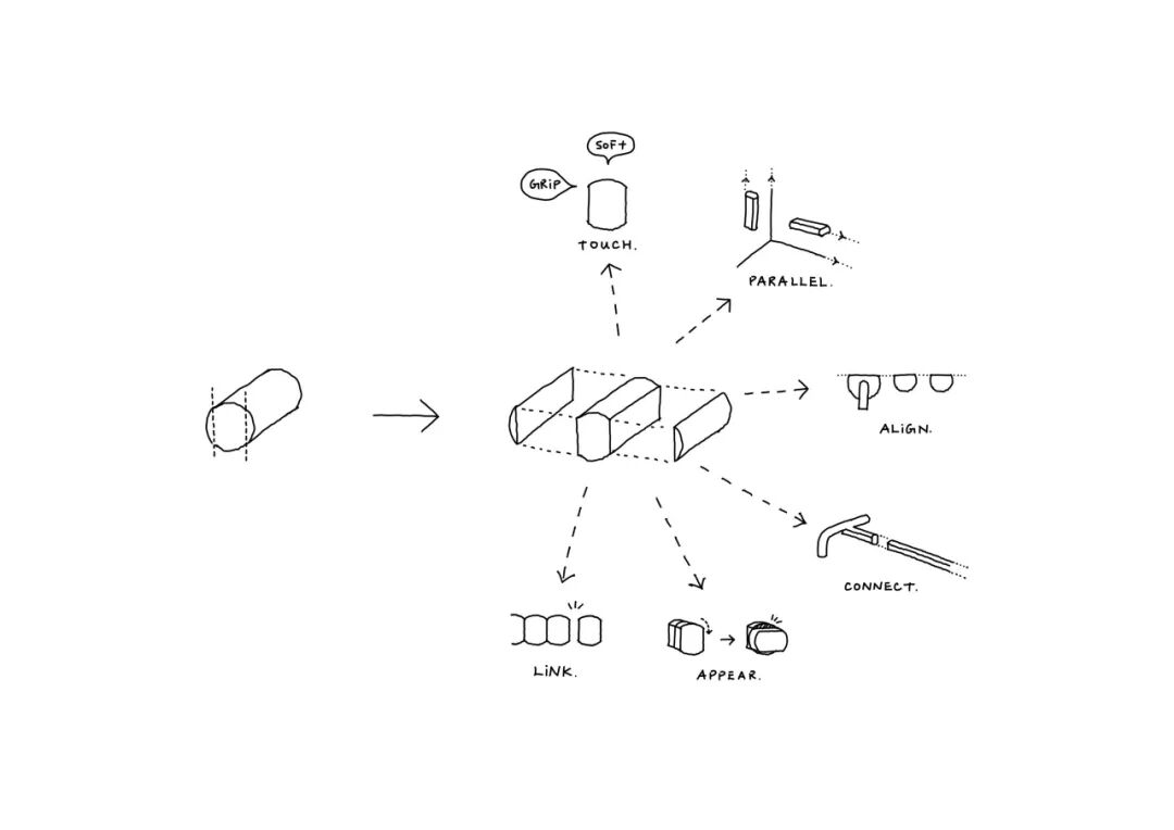 建筑硬件的功能和作用的多样性意味着它们的形式和饰面也多种多样,加在一起,它们会产生视觉噪音。基础元素是一个圆柱体,其侧面有一个“面”。圆柱体在手上很容易,但握起来很滑。此外,当多个圆柱体彼此相邻时,会形成一些间隙。创建面可以解决这个问题此外,由于设计强调垂直或水平线,硬件不会干扰现有的水平地板和垂直墙壁。