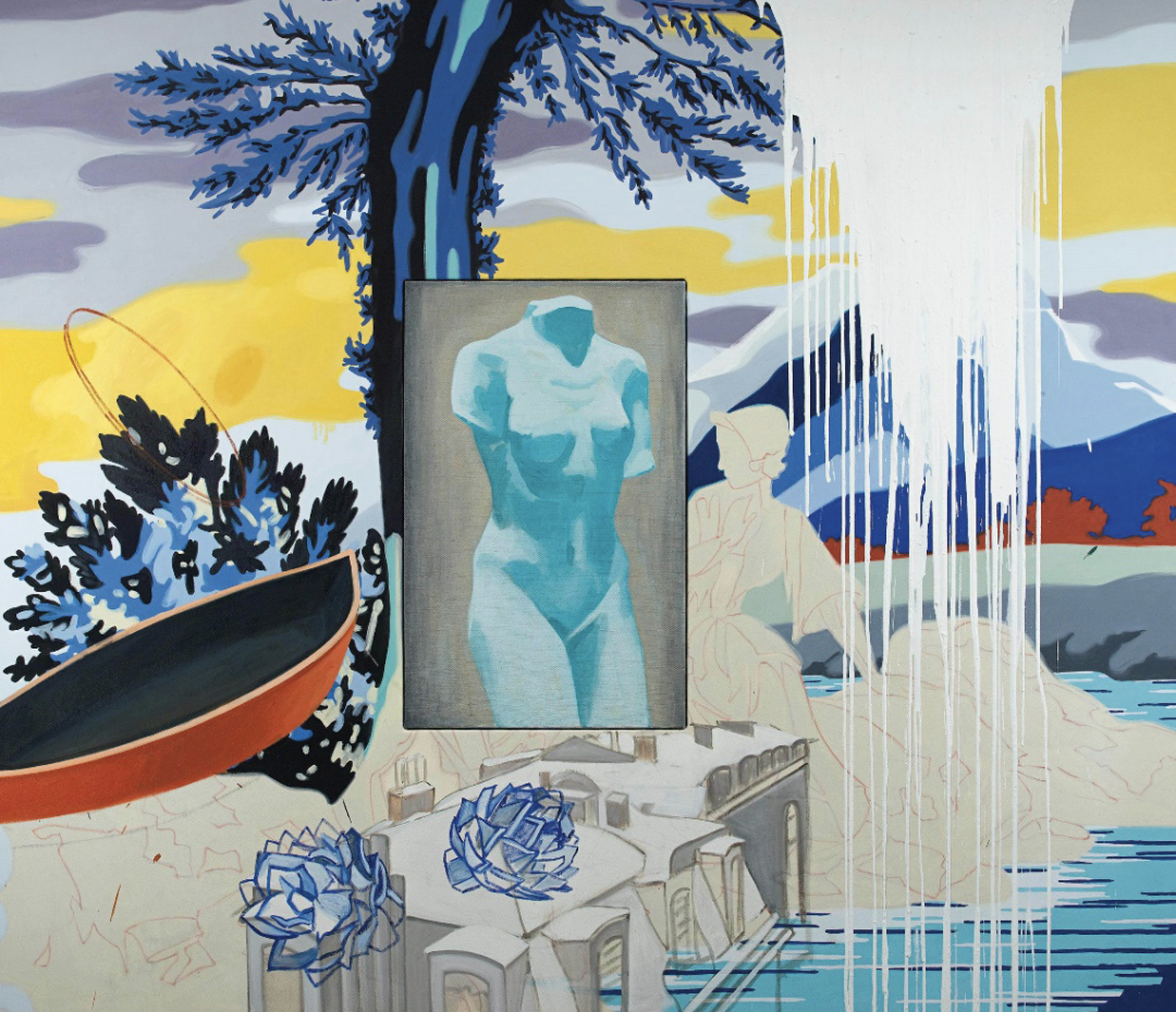 断裂成为了一种趣味。碎片化的不止是信息,在界面世界里的空间,符号,这些载体承载的情绪,以及用户的注意力,认知事物的过程……这一切都是碎片化的。于是碎片化的呈现,以及信息之间完全不连贯的断裂性构成了吴凌昊对于数字-界面世界考察的另外一个重要环节。大卫.萨利 (David Salle) 同样是一个聚焦于这种信息断裂产生趣味的艺术家。吴凌昊在绘画中所做的不仅是指出这种断裂的存在,而且还发展,深化这种断裂,以至于发展到了一种荒诞的地步(以及在他的作品中,信息的断裂比比皆是)。但这种荒诞反过来又展现出一种对于我们熟悉的数字-界面世界断裂特性的去魅姿态。