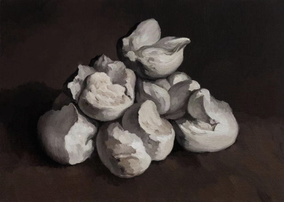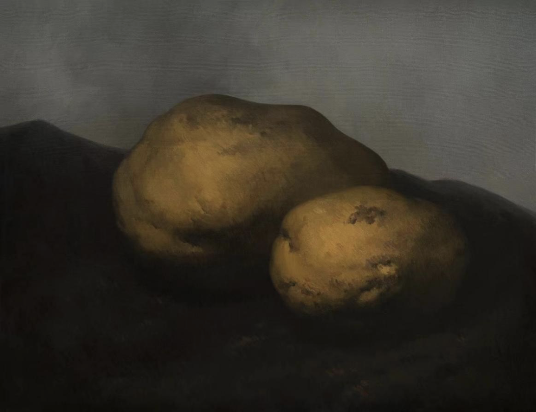 这就是乡愁——一种永远无法回到的失落故乡。它可能是一个实体的地方,也可能是一个记忆中的世界。虽然生活在60-70年代的那些日子和今天的生活质量无法媲美,但作为一个经历过那个年代的人来说,有些真挚的东西,有些那时候无法理解的意义,有些当时无法真正了解的情感,在后来的80-90年代中不可避免地衰落了,并且最终遗失在了岁月里几近遗忘。但这些在60和70年代时的年轻人,也许会在看到闫冰所画的土豆与馒头时突然回想起关于自己青春的很多记忆。闫冰用他高超的造型能力和对颜色的精细把握创造出这种在简单物象中引发的乡愁情怀。