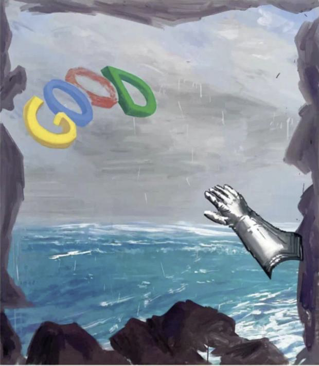 GOOD的后网络逻辑体现在这个单词的字体和呈现方式与Google的logo之间存在的共性。在2022年,公共空间中出现四元色的GOO字母的时候,大多数人的第一反应应该会是Google,也就是说因为Google的logo设计的成功以及Google这个词里面对于GOOD的暗指,让GOOD的所指里面也饱含了Google,而Google的所指里面也饱含了GOOD。吴凌昊对于这个四色GOOD的发明和使用构成了他对绘画的形式趣味与网络文化的形式趣味之间的互相渗透。