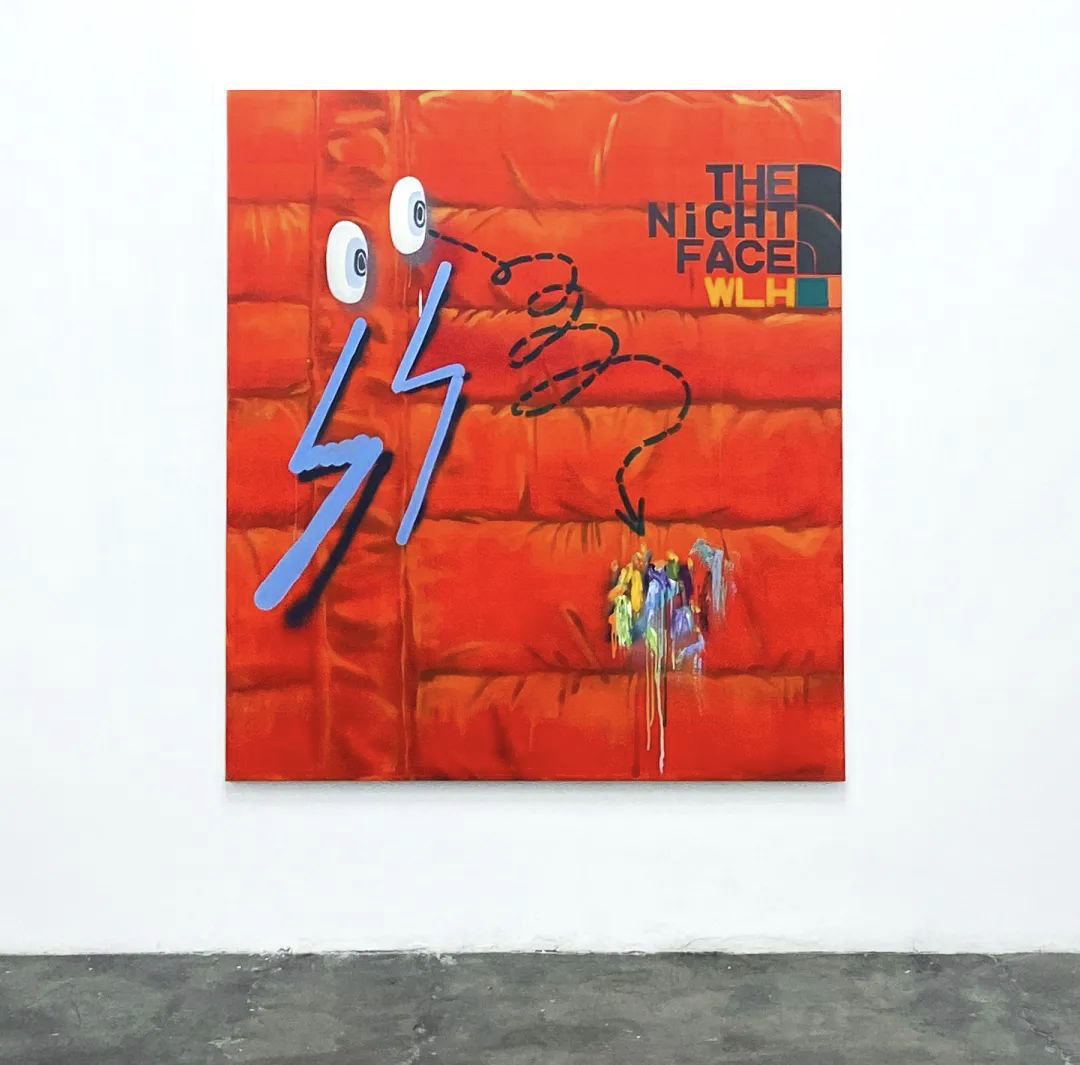 由这些原则和方法构成的一种设计成规就构成了一切界面设计背后的底层逻辑,而有趣的是,这些原则似乎也贯彻在吴凌昊的诸多作品之中。比如在下图的作品No face(2021),作为一件辨识度比较高的吴凌昊的作品,就带有诸多由以上原则构建的视觉元素。比如背景中的若干横线所构建的基础的稳定性和秩序感;以及与背景秩序感造成明显对比的是前景中的眼睛,闪电,卷曲的弧线以及一个意味不明的色块等无明显逻辑且颜色与背景产生巨大反差矛盾的元素。最后右上角的模仿“北脸”品牌的logo以共形法的方式让自己在背景与前景之间找到了一个合理的关系。