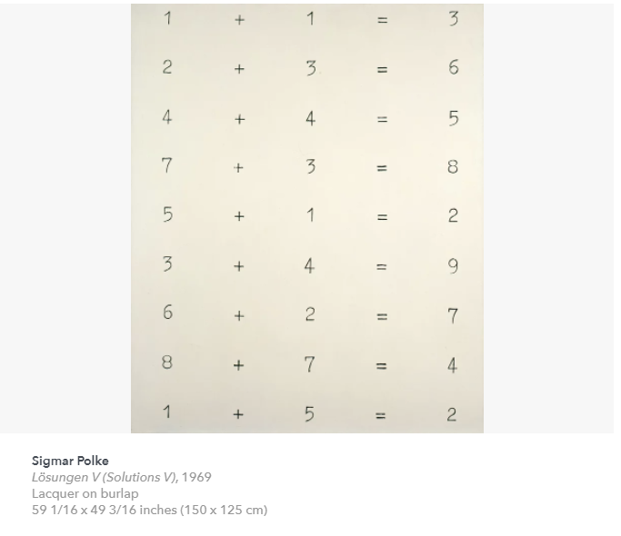 对于GOOD这个单词或者说这四个大写字母的选择,其本身包含了图像-认知逻辑以及后网络的逻辑。对于图像-认知逻辑来说,简言之,人们对于在图像中呈现出的内容带有强烈的认可倾向,而不是怀疑倾向——即便我们明知道图像中的内容所呈现的逻辑是错误的。这种现象在日常的生活中可以追溯到我们对于“网络照”的接受,也就是尽管我们知道某一张网红发在小红书或者某平台的照片是经过滤镜渲染的,经过精修和拉长的,但这些知识依旧无法抵消我们去观看那样一张数字图像的冲动和兴趣。在波尔克(Sigmar Polke)的作品Losungen V (1969) 当中,艺术家罗列了9个错误的数学等式,凸显出这种图像与认知之间的惰性关系。在吴凌昊的作品中,因为GOOD的出现以及在画面空间中的旋转,仿佛观者就会更倾向于认为这张画是好的。这种看似可笑的洗脑方式,其实却是在数字世界中隐藏在界面文化里的底层工作原理——“Seeing is Believing”。