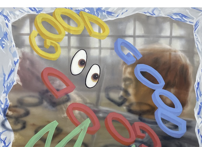 在吴凌昊的作品中,采用微软四色元素的GOOD字母成为一个高频出现的绘画元素。这个单词有时候如神明般出现在画面的天空中,比如《好风景》;有时候好几个GOOD单词组成一个圆盘在画面中“盘旋”,比如《我想做个好人》;在作品《背面》中,GOOD的四个字母分别隶属于画面四部分组成的四个幻觉物象空间内。