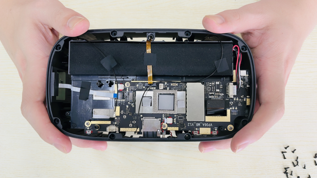而在 P1 Ultra 4K主板之上,还有丰富的外部拓展接口,3.5mm 耳机孔、Type-C 快充接口、拓展卡槽一应俱全。外侧还有一块容量高达 4000 毫安的锂电池,以细长的形态固定于主板外侧。