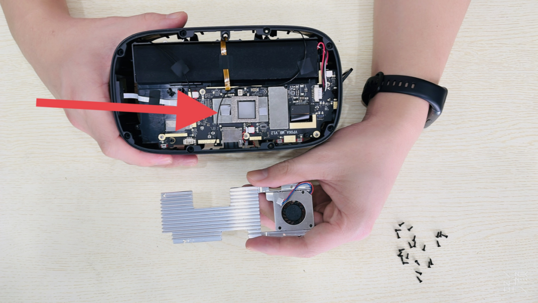揭开散热模组即可看到大朋VR P1 Ultra 4K 的核心主板部分,在核心套片上也有三块“矩形”导热硅脂,它主要用于填充 CPU 与散热片之间的空隙,将芯片所产生的热量传导于上方散热模组中。