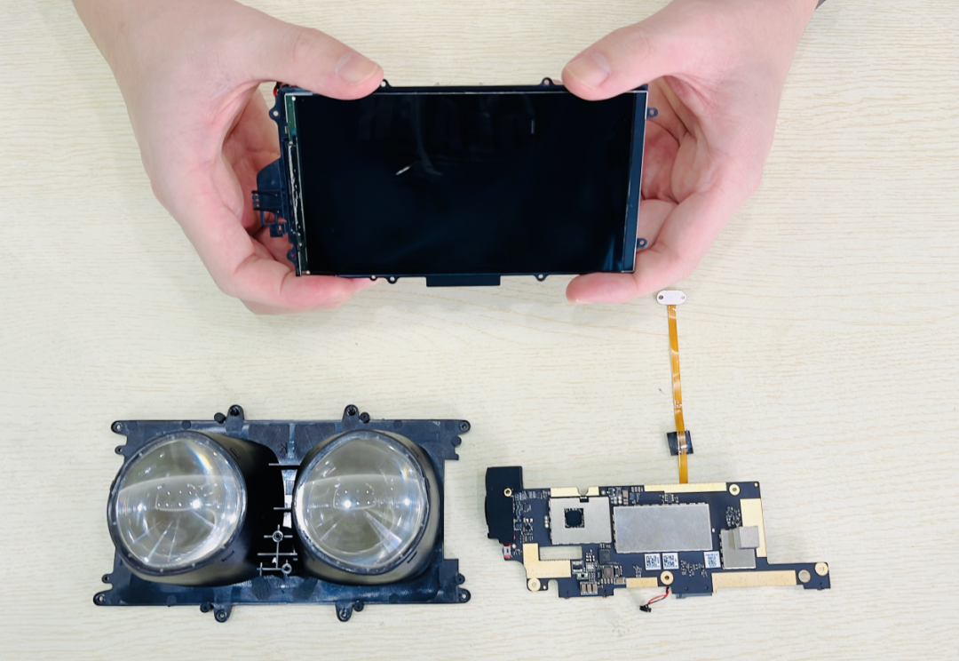 该屏幕分辨率为 3840 x 2160,在通电后,整块屏幕将左右分屏显示来实现 VR 沉浸感。