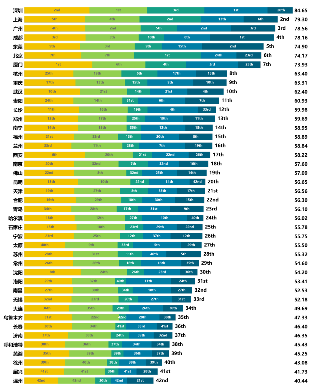 引入政策因素后,代表城市TOD吸引力的磁力指数的城市排名产生了变化,除深广上北四个一线城市之外,成都、东莞、厦门、杭州、重庆、武汉也成为了内地最具发展潜力的TOD 城市。