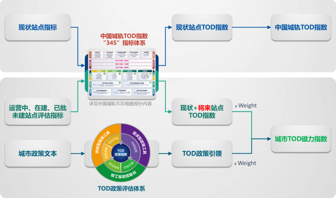 编制组立足中国城轨TOD指数对于城市已有人口规模、工作岗位、土地利用、服务设施、物业价值和城市轨道交通运营现状的客观分析评估,结合城市规划轨道站点发展、TOD战略与政策等因素,拓展了中国城轨TOD指数体系的应用场景。TOD 是各种生产生活要素集聚的磁场,我们期待通过主动的规划引领与政策支持,进一步增强TOD的磁吸效应,吸引更多优质的资源和投资主体共同进行 TOD 综合开发。因此,编制组将评估城市TOD发展前景的指数定名为“城市TOD磁力指数”。