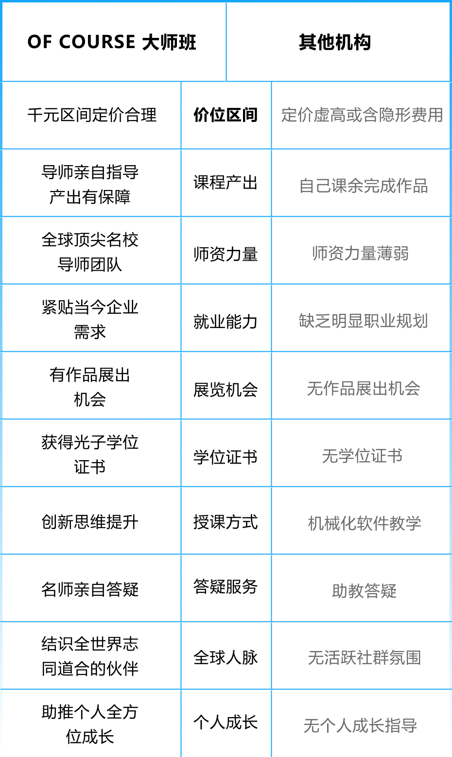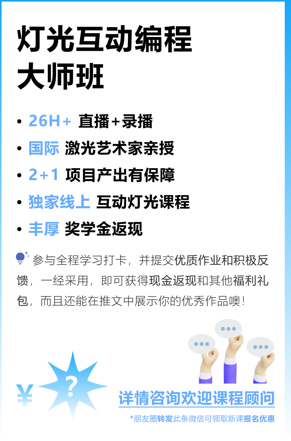 你不仅会在全球顶尖导师的带领下运用12周内所学的技术最终完成一件灯光互动艺术作品,而且还会结识众多志同道合的伙伴。课程结束后将为你颁发OF光子证书,申请全球顶尖大学的推荐信和作品集点评机会,以及内推工作机会。