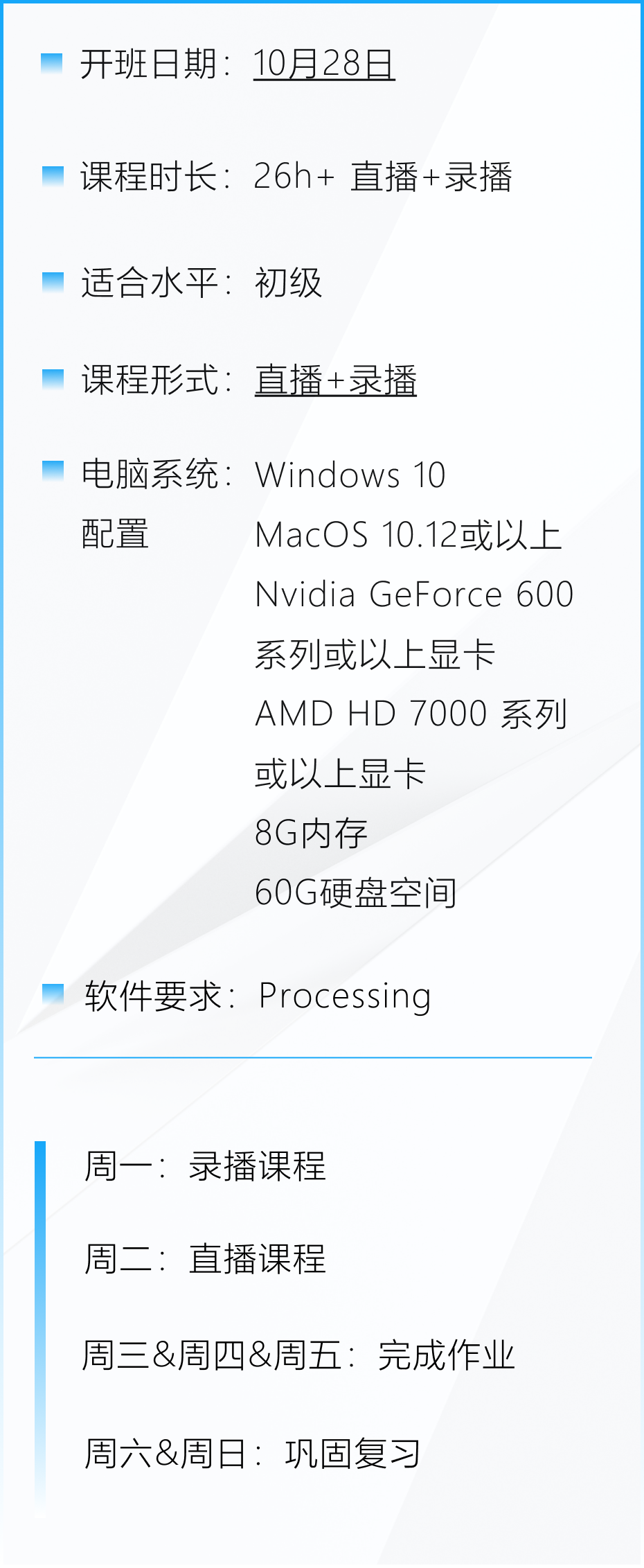 我们的课程是适合零基础的学员的,可以跟着老师一步步从Processing安装到最后的作品产出。如果感到有困难,都可以在群里向老师或者班主任进行询问,我们都会给到解答的。