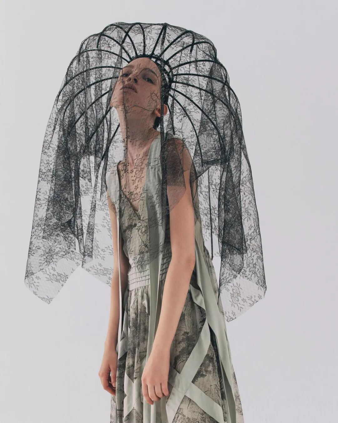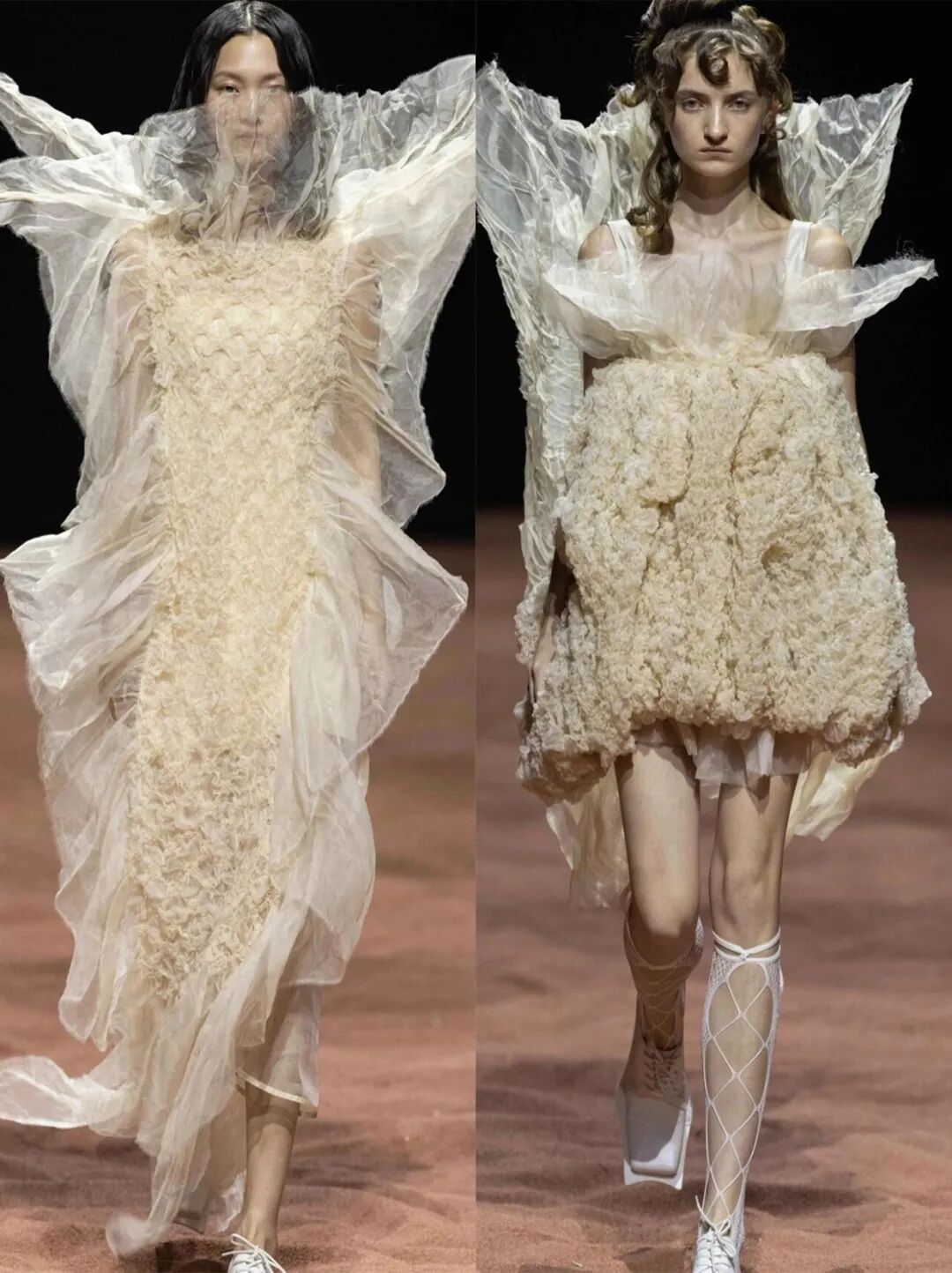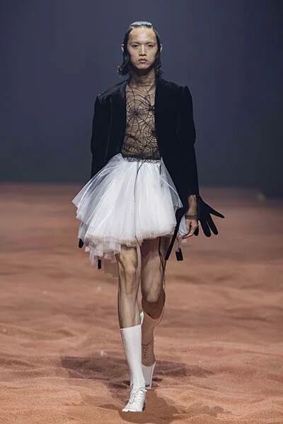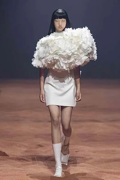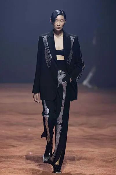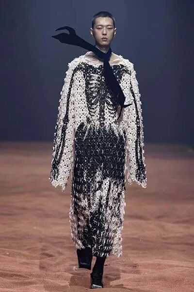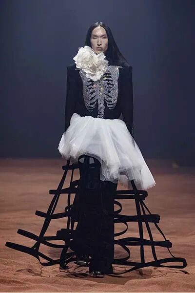 设计师无意采用固定的外形设计,而是以不断变化的多元形态,例如人体刺绣、大花朵褶皱领饰以及夸张的裙撑来展现生命的无常。用最简单和平凡的材质去表达,把原本短暂和易抛弃的特质转化成一种长久。骨骼刺绣打底衣是本季发布非常重要的一个单品。