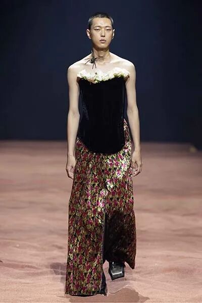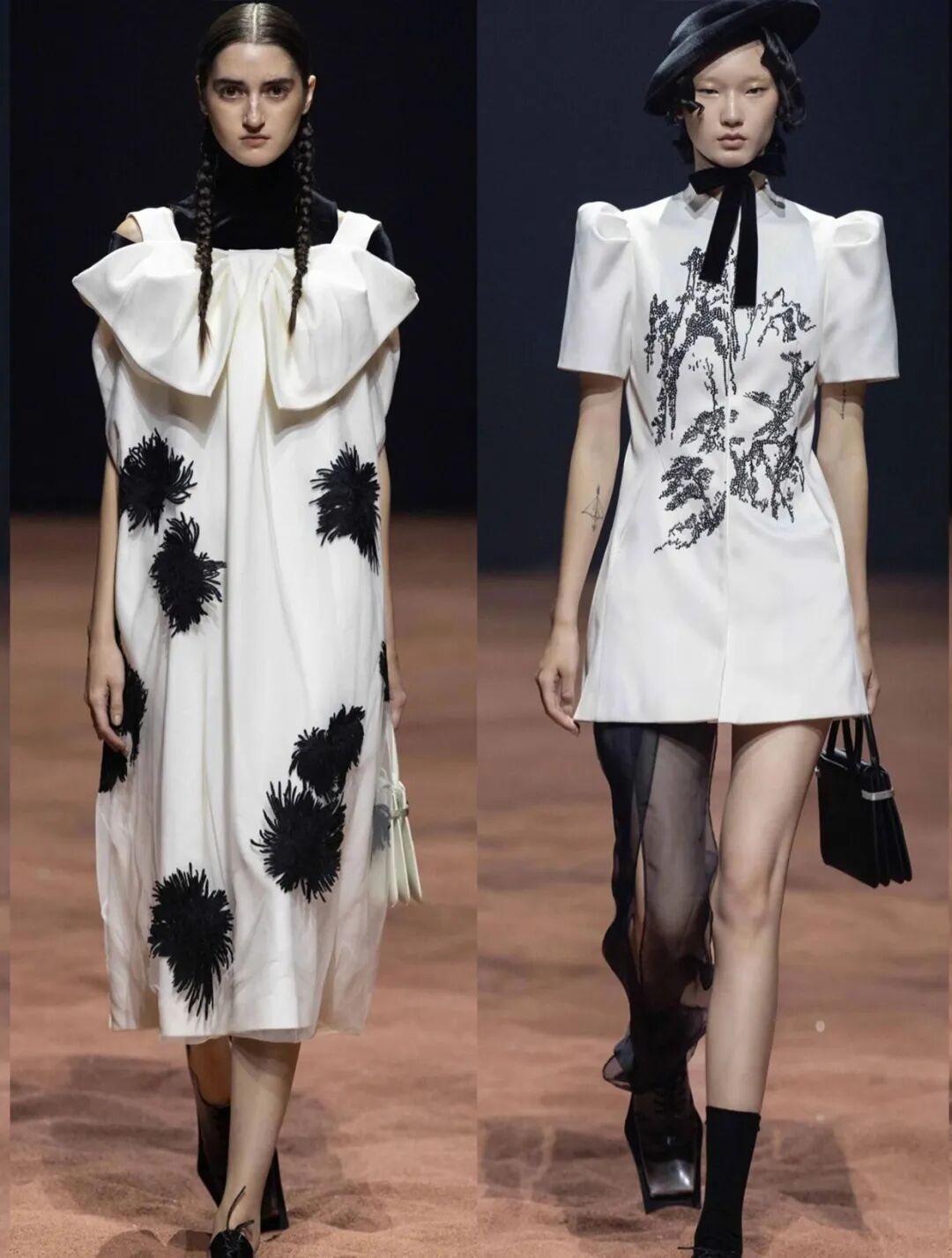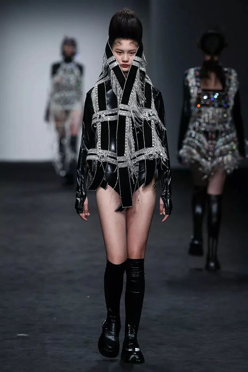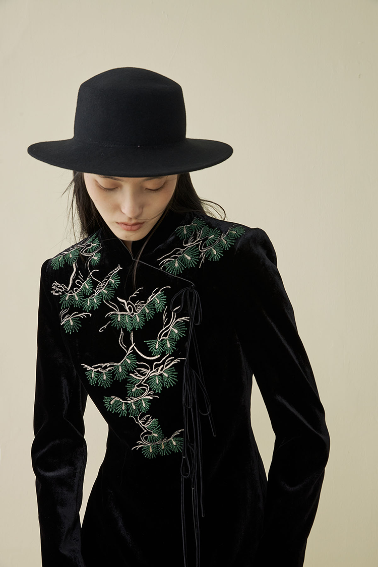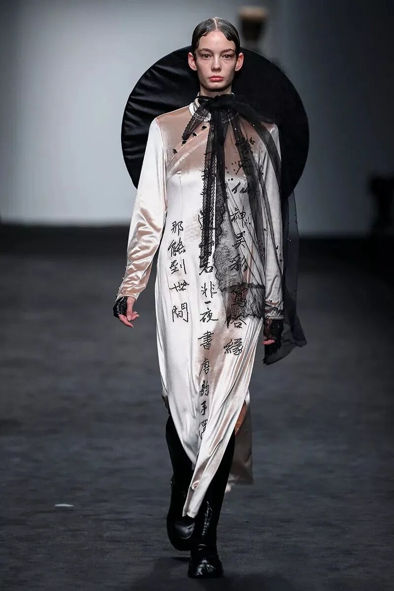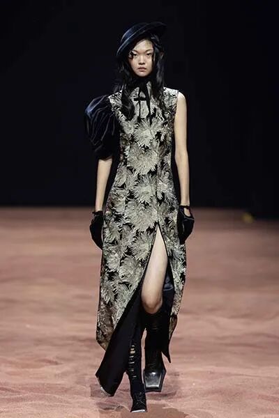 系列的重点也放在有限和无限的冲突中,被限制的确定性和冲破限制的开放性是有趣的尝试。无论是趋于暗黑戏剧化夸张的钉珠、流苏、束胸设计,亦或是从古典花卉纹样、旗袍、汉字中提取的中式设计元素,BAN XIAOXUE 无不作出了相较于以往颠覆性的全新尝试。
