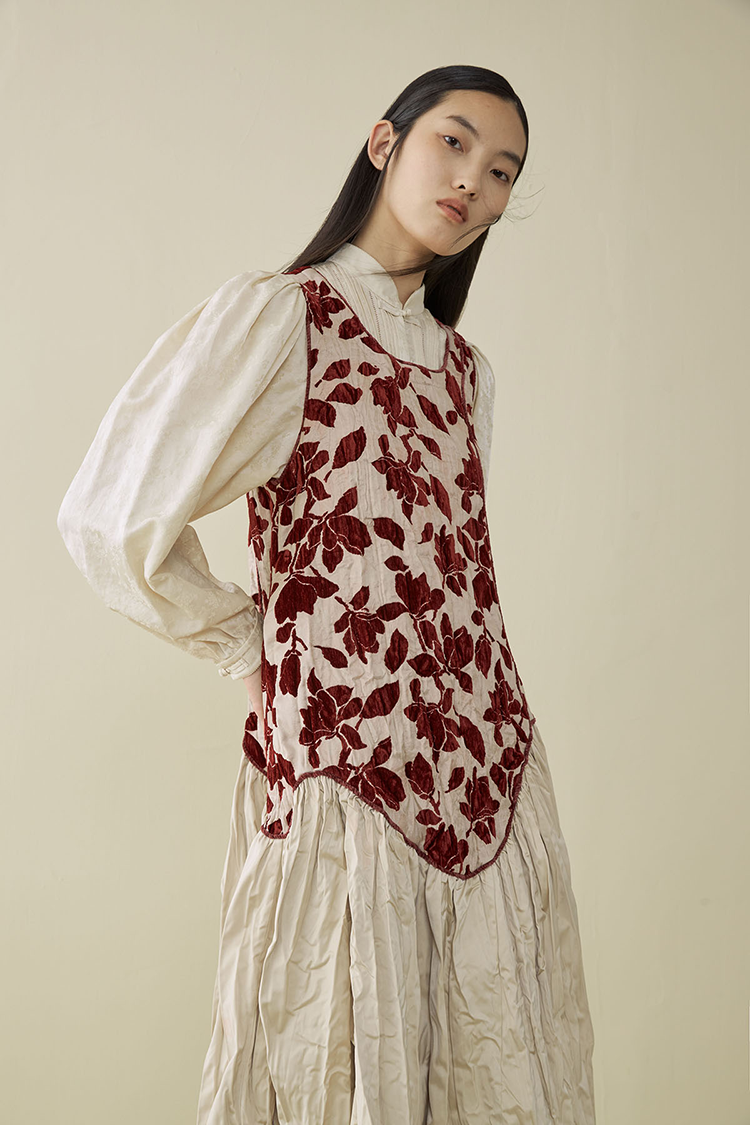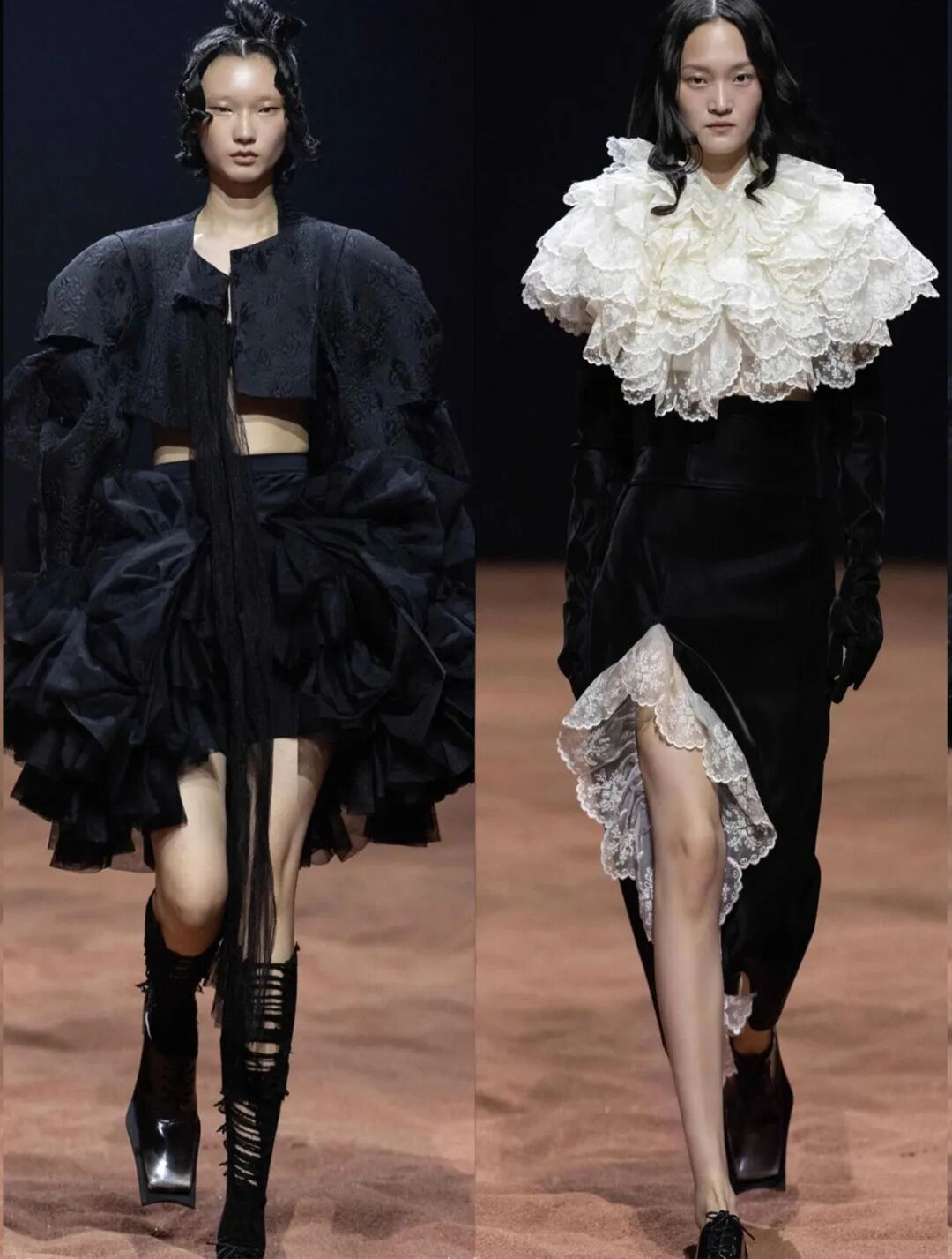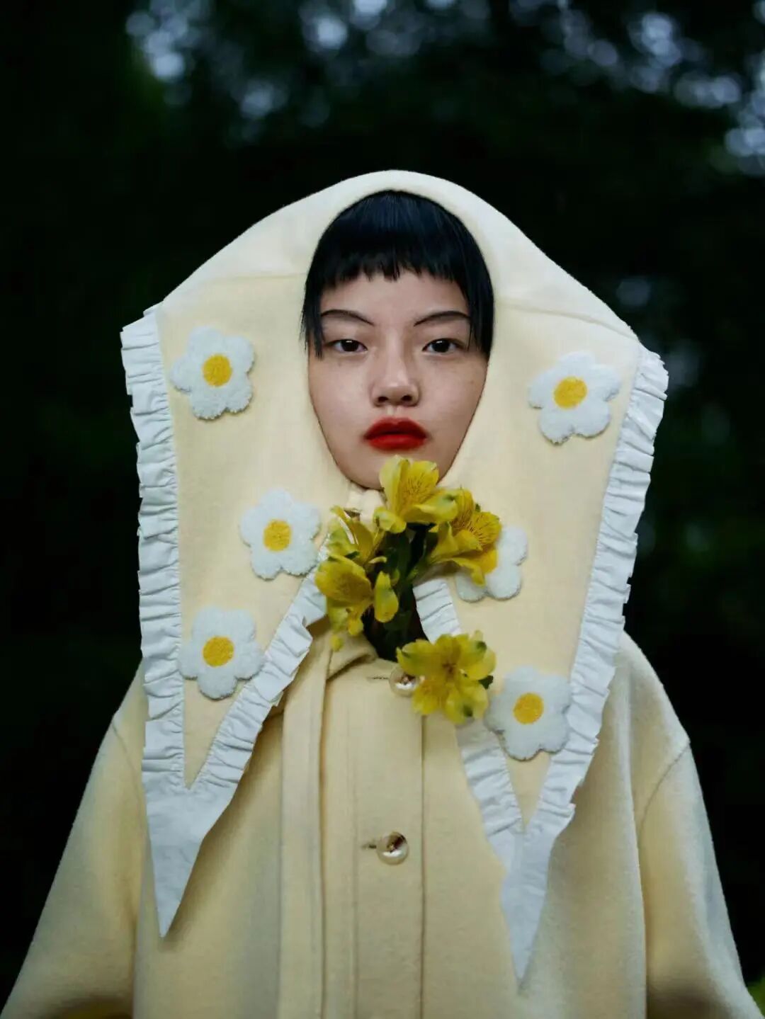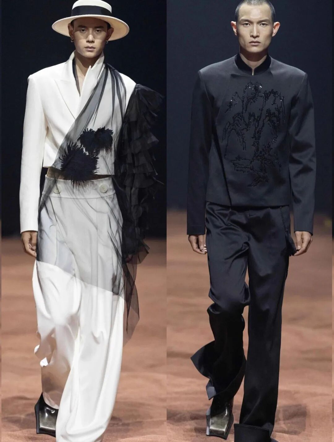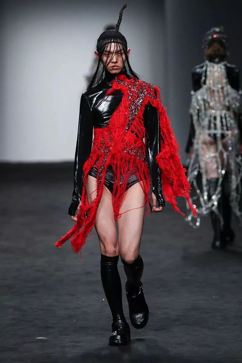 系列的重点也放在有限和无限的冲突中,被限制的确定性和冲破限制的开放性是有趣的尝试。无论是趋于暗黑戏剧化夸张的钉珠、流苏、束胸设计,亦或是从古典花卉纹样、旗袍、汉字中提取的中式设计元素,BAN XIAOXUE 无不作出了相较于以往颠覆性的全新尝试。