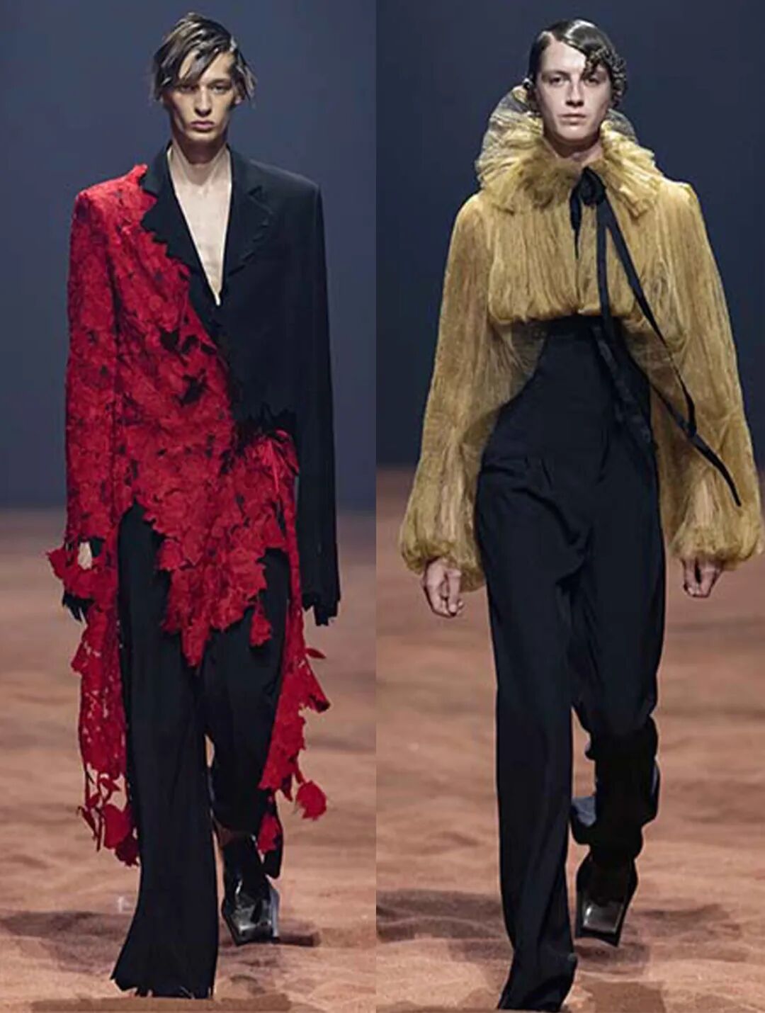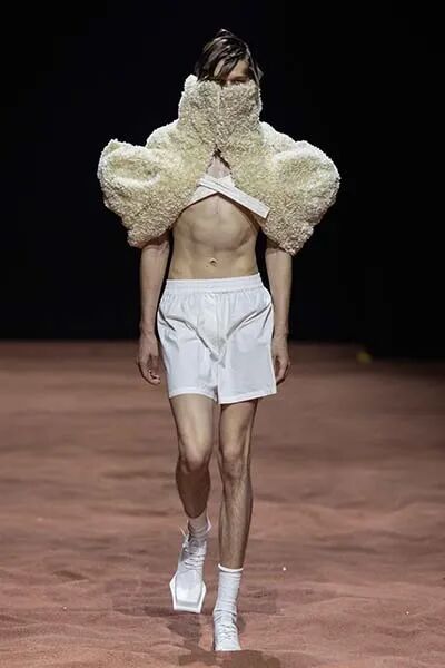 此次大秀与艺术家王子月合作,用剧场的概念来设计秀场,采用荒原的表现形式,将红色泥土与几何装置相融合,引入一个虚幻的空间。
