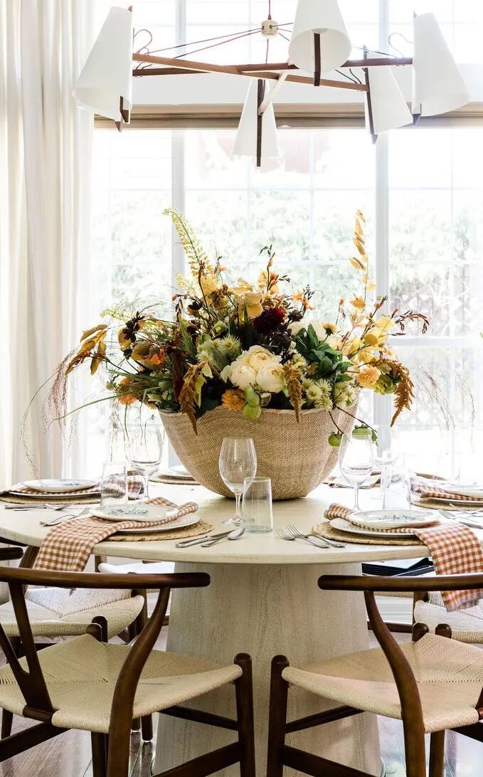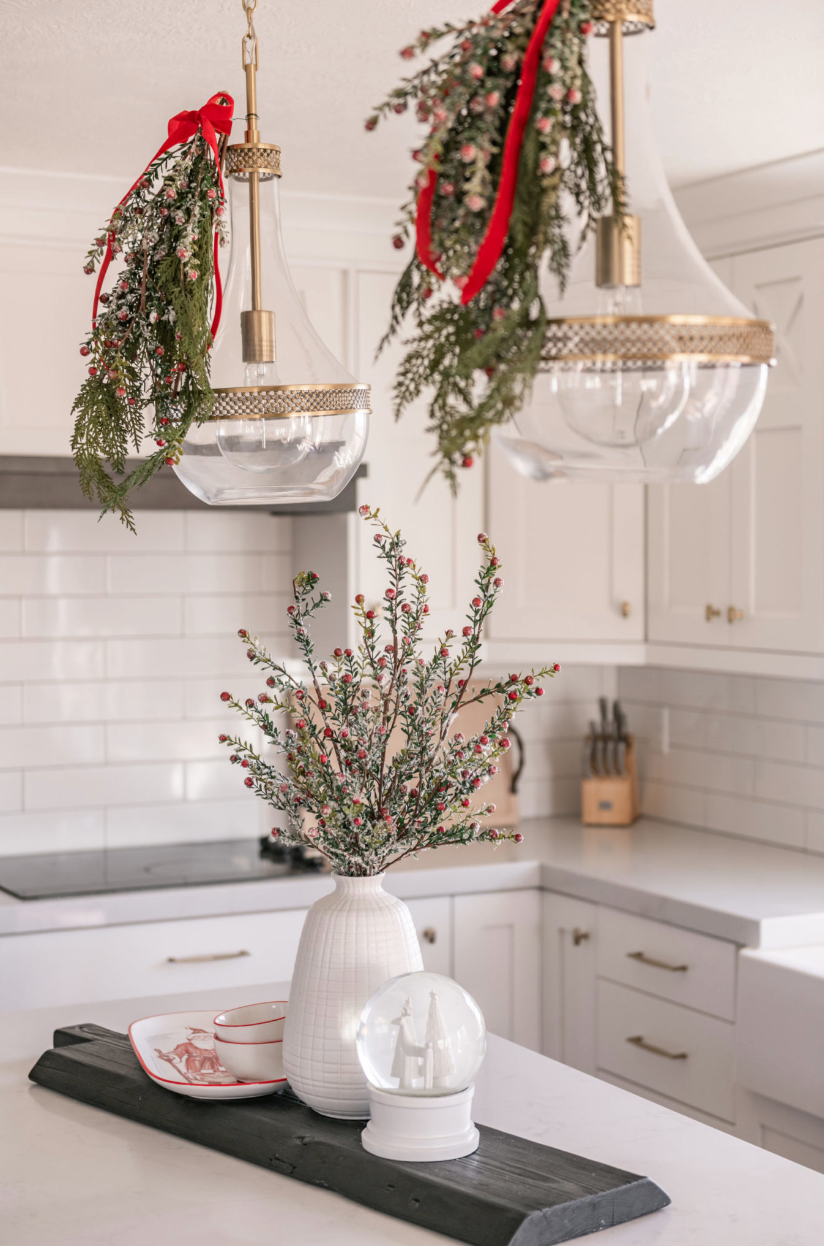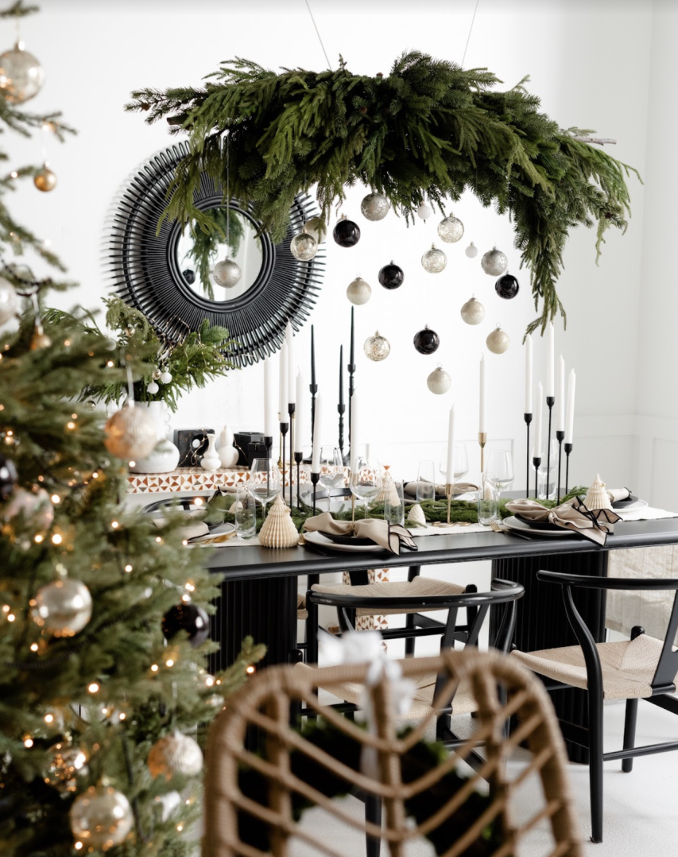 在餐桌上方悬挂一些装饰品和吊坠,将家中的的圣诞氛围提升到新的“高度”。或者在桌面摆放一盆适合家中氛围的花或者树,用额外的饰品、干花、枝条点缀餐桌,创造充满节日气氛,同时又温暖而温馨的就餐空间。