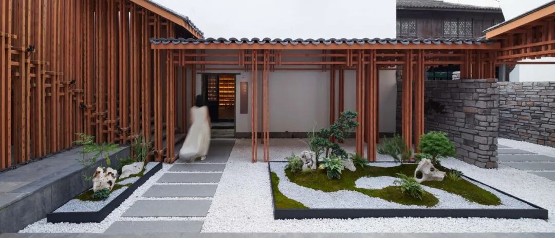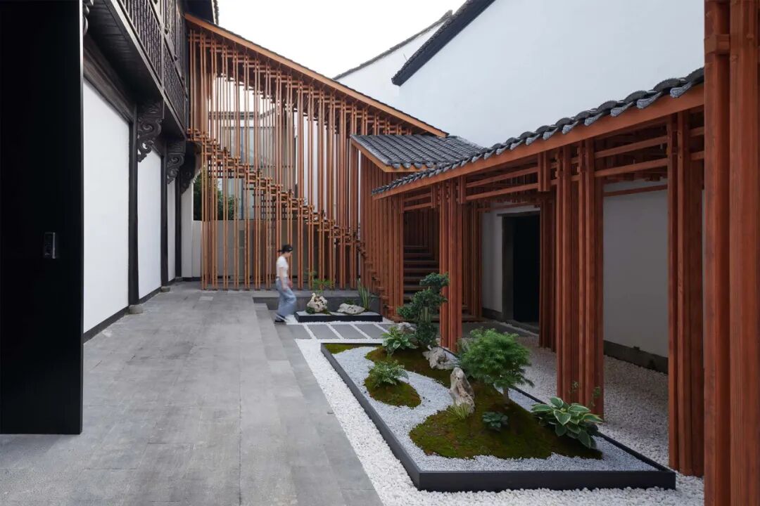 设计上保留了立面上半部分的传统风貌,二层对外的花格门窗都被完整保留;而一层部分则使用了更现代的“类斗拱式”的当代转译木构搭接成入口雨廊,在其背部用打孔铝板绘制了枇杷果实的剪影。