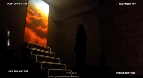 “THIS WAY OUT”是法国团队lnlo在柏林创造的地下沉浸式迷宫。整个空间出现闪烁的楼梯,透过窗,又好像出现红色的云层,与地面的云层遥相呼应。让人分不清到底是在地下,还是在天上。