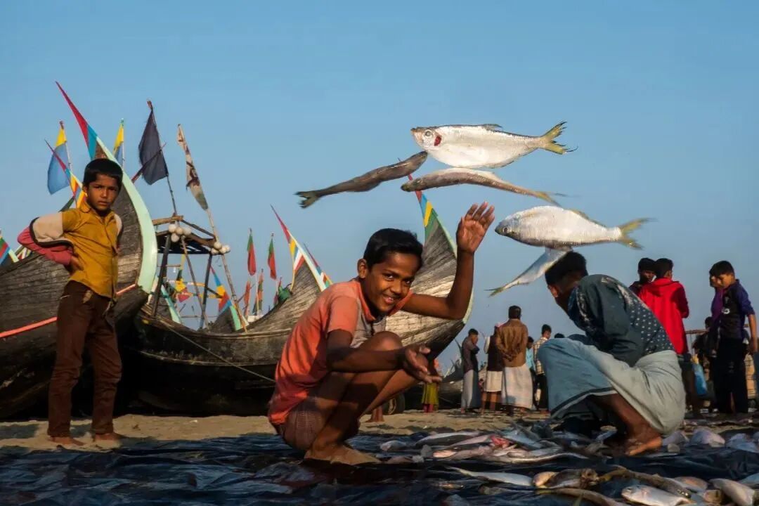 这个镜头捕捉的画面很精彩,你不确定画面中的男孩什么时候会转过头来。画面中男孩的目光和飞跃的鱼视乎是摄影师安排好的一样。
