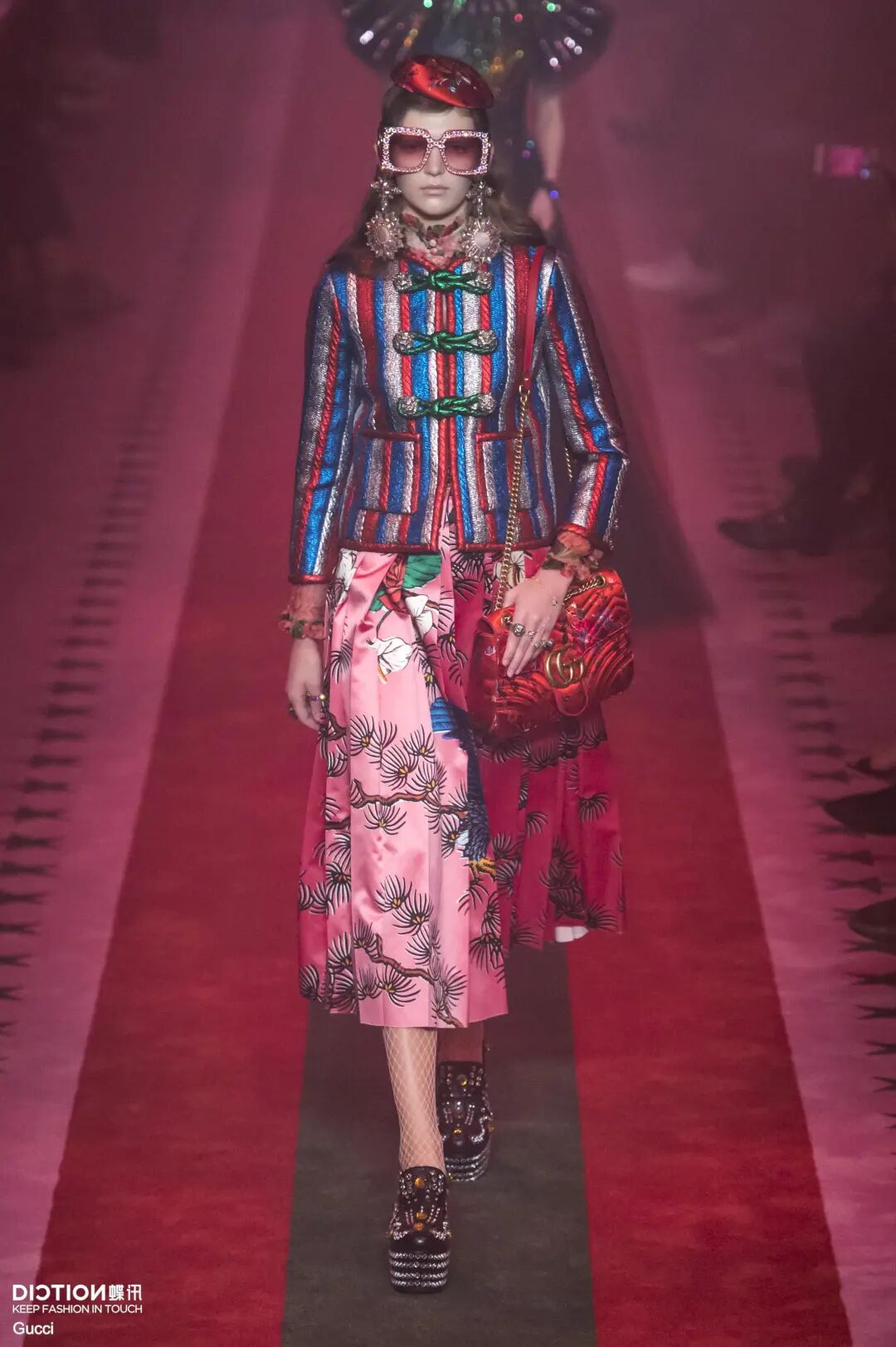 正如Alessandro Michele所说的“我对中国文化极其着迷,它来自一个看似遥远但又与欧洲有着紧密联系的地方,它影响着欧洲文化,改变其观点,提醒了一个事实,我们并不单一,而是丰富多样的”,他将中国传统盘扣与丰富的欧洲服饰相结合,打造出其不意的视觉感。