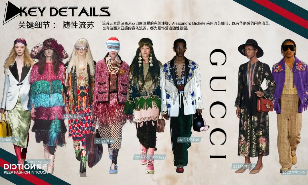 流苏元素是波西米亚自由洒脱的完美注脚,Alessandro Michele采用流苏细节,既有华丽感的闪亮流苏,也有波西米亚感的宽条流苏,都为服饰营造随性氛围。