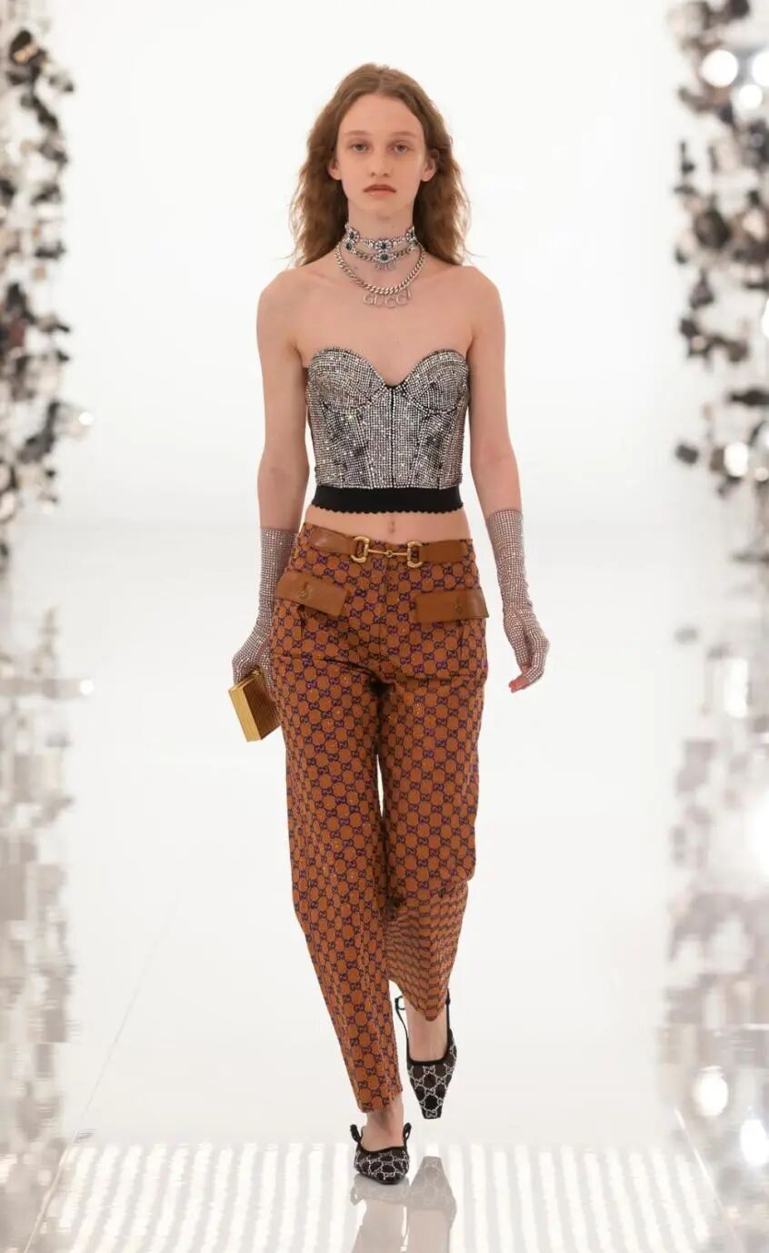 闪耀烫钻是可以将摇滚感与华丽感做完美结合的细节,Alessandro Michele将其与宫廷复古感纹样、条状纹样、点状排列相结合,足够的吸睛而又不俗套。