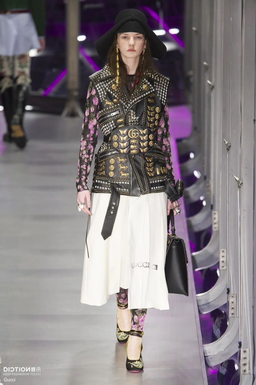 AlessandroMichele酷爱采用铆钉元素,为 GUCCI 服饰注入摇滚自由灵魂,同时机车单品也是其秀场十分常见的单品。